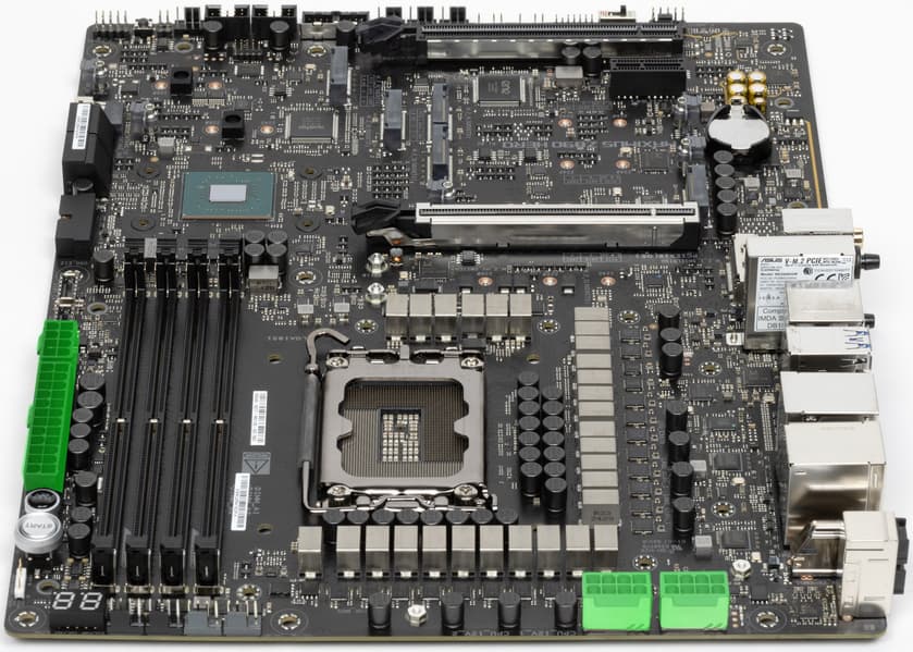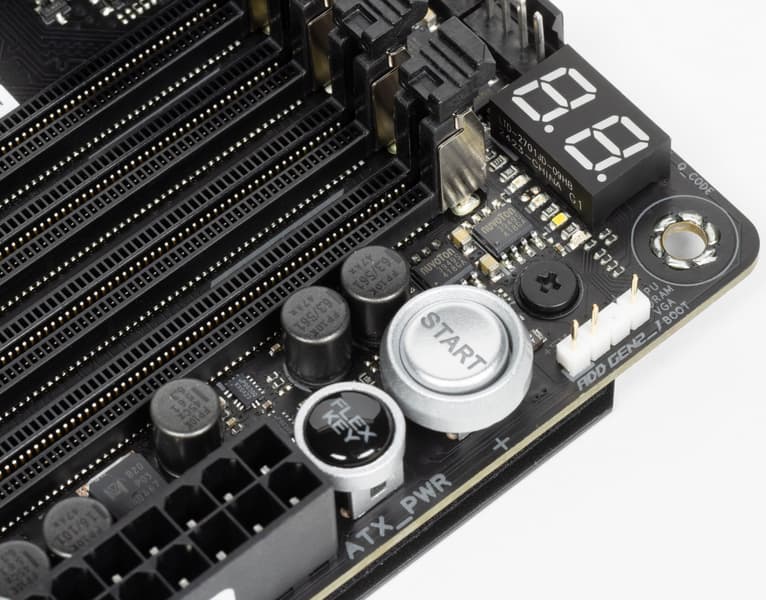 Для питания платы на ней предусмотрены 4 разъема: в дополнение к 24-контактному ATX (он на правой стороне платы (на фото — слева) здесь есть еще два 8-контактных EPS12V (они имеют металлическое армирование), а также 8-контактный PCIe для поддержки усиленного питания USB 3.2 Gen2x2 Type-C (с целью обеспечения быстрой зарядки мобильных устройств – до 60 Вт).