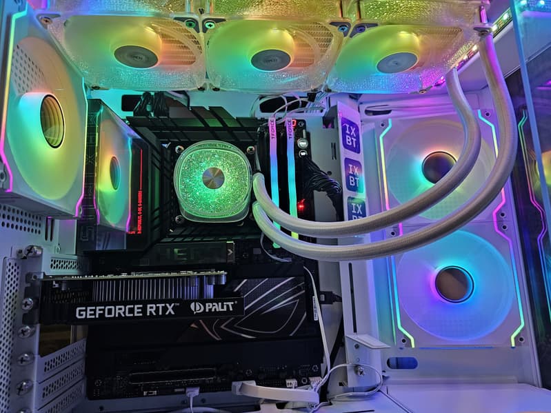 В арсенале платы также есть 4 порта SATA и 8 разъемов для вентиляторов. Система питания процессора очень и очень мощная, способная обеспечить работу любых совместимых процессоров с приличным запасом на разгон. Плата имеет грамотную систему охлаждения каждого потенциально греющегося элемента, включая накопители в слотах M.2 (термопрокладки для охлаждения накопителей в 4 слотах есть с обеих сторон). Сетевые возможности прекрасные: два быстрых проводных контроллера (5 и 2,5 Гбит/с) и один самый современный беспроводной — Wi-Fi 7 + Bluetooth 5.4. В числе плюсов платы можно упомянуть неплохую стильную подсветку, а также широкие возможности для подключения дополнительных RGB-устройств.
