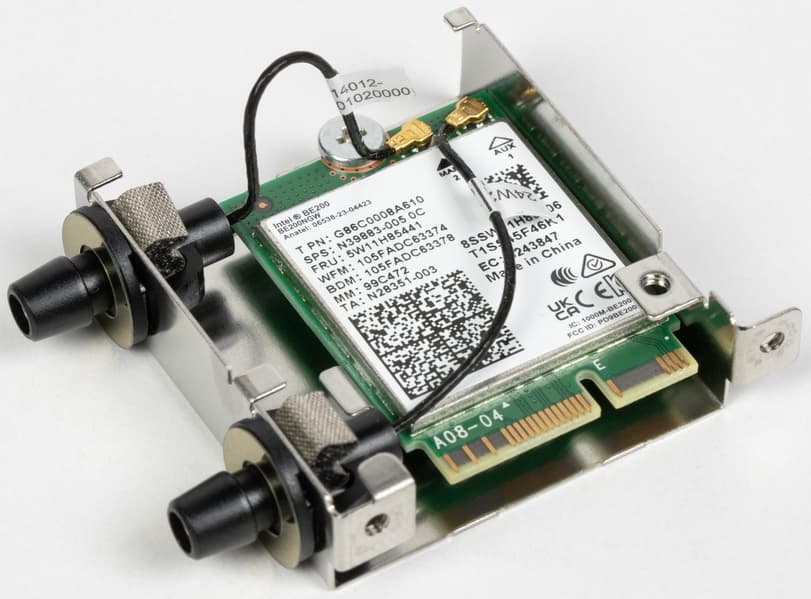 Имеется и комплексный беспроводной адаптер на контроллере Intel BE200, через который реализованы Wi-Fi 7 (802.11a/b/g/n/ac/ax/be, 2,4/5/6 ГГц) и Bluetooth 5.4. Он установлен в слот M.2 (E-key), и его разъемы для выносных антенн выведены на заднюю панель.