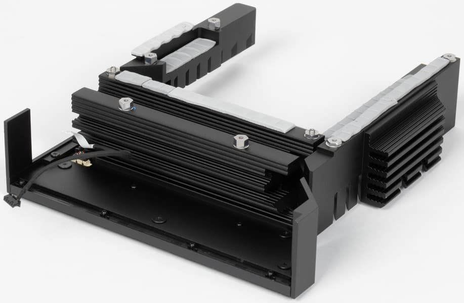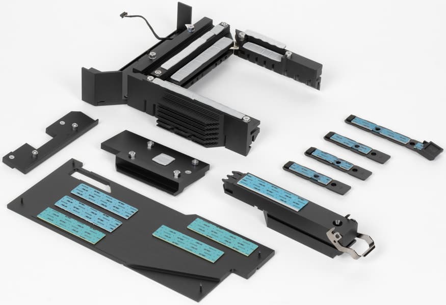 Все M.2 слоты имеют радиаторы. Верхний M.2_1 обладает отдельным мощным радиатором, когда как остальные все слоты M.2 имеют общий радиатор. Слоты M.2, получающие данные от CPU (M.2_1/2/3/4) кроме верхних радиаторов еще имеют радиаторы для охлаждения тыльной стороны модулей.