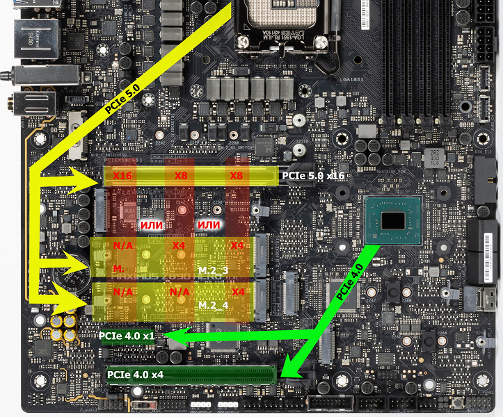 Выше я вел речь про первый PCIe x16_1, подключенный к процессору. Остальные PCIe x16_2 и PCIe x1 подключены к Z890, и работают в режимах x4 и x1 соответственно.