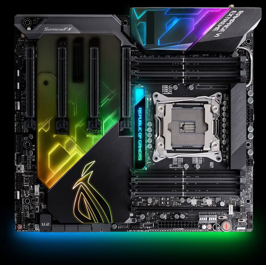 Плата Asus ROG Rampage VI Extreme основана на новом чипсете Intel X299 и поддерживает процессоры Intel Core-X с разъемом LGA 2066. Как известно, в семейство Intel Core-X входят процессоры Skylake-X и Kaby Lake-X, причем Kaby Lake-X — 4-ядерные модели, которые имеют 16 линий PCIe 3.0, а процессоры Skylake-X могут иметь 28 или 44 линии PCIe 3.0. Так вот, в руководстве на плату Asus ROG Rampage VI Extreme нигде не говорится о поддержке процессоров Kaby Lake-X. Нет этих процессоров и в списке совместимых моделей на сайте компании. То есть одной из отличительных особенностей Asus ROG Rampage VI Extreme является то обстоятельство, что поддержка процессоров Kaby Lake-X тут не заявлена.