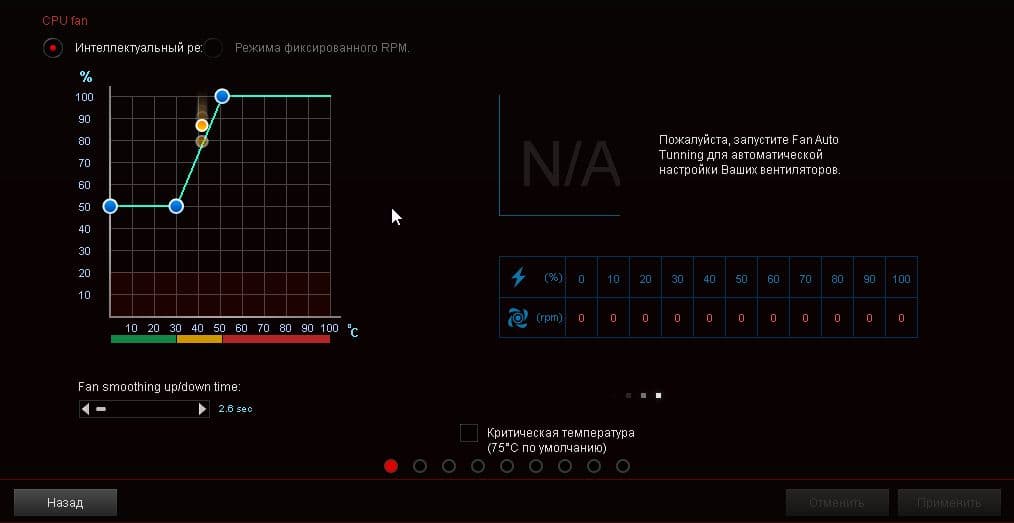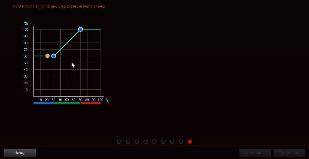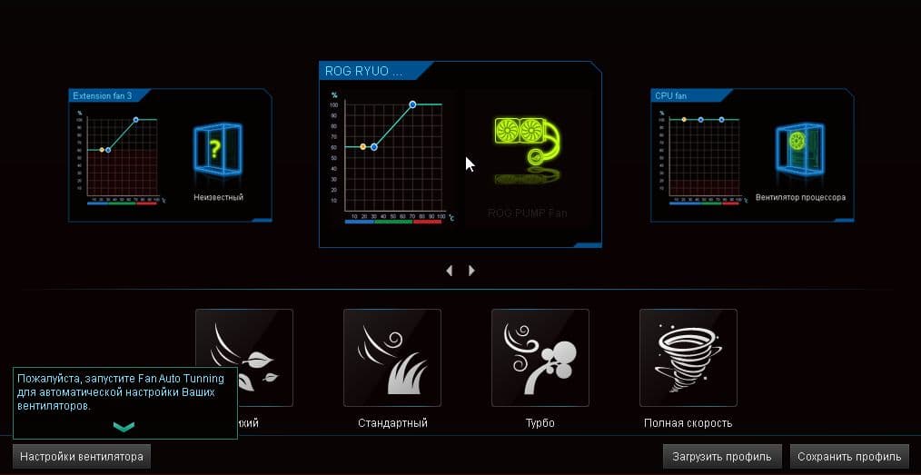 К рассматриваемой системе охлаждения относятся функция настройки скорости вращения вентиляторов системы (окно ROG Ryuo Fan) и помпы (окно CPU fan, так как помпа была подключена к разъему для процессорного кулера) в зависимости от температуры процессора.