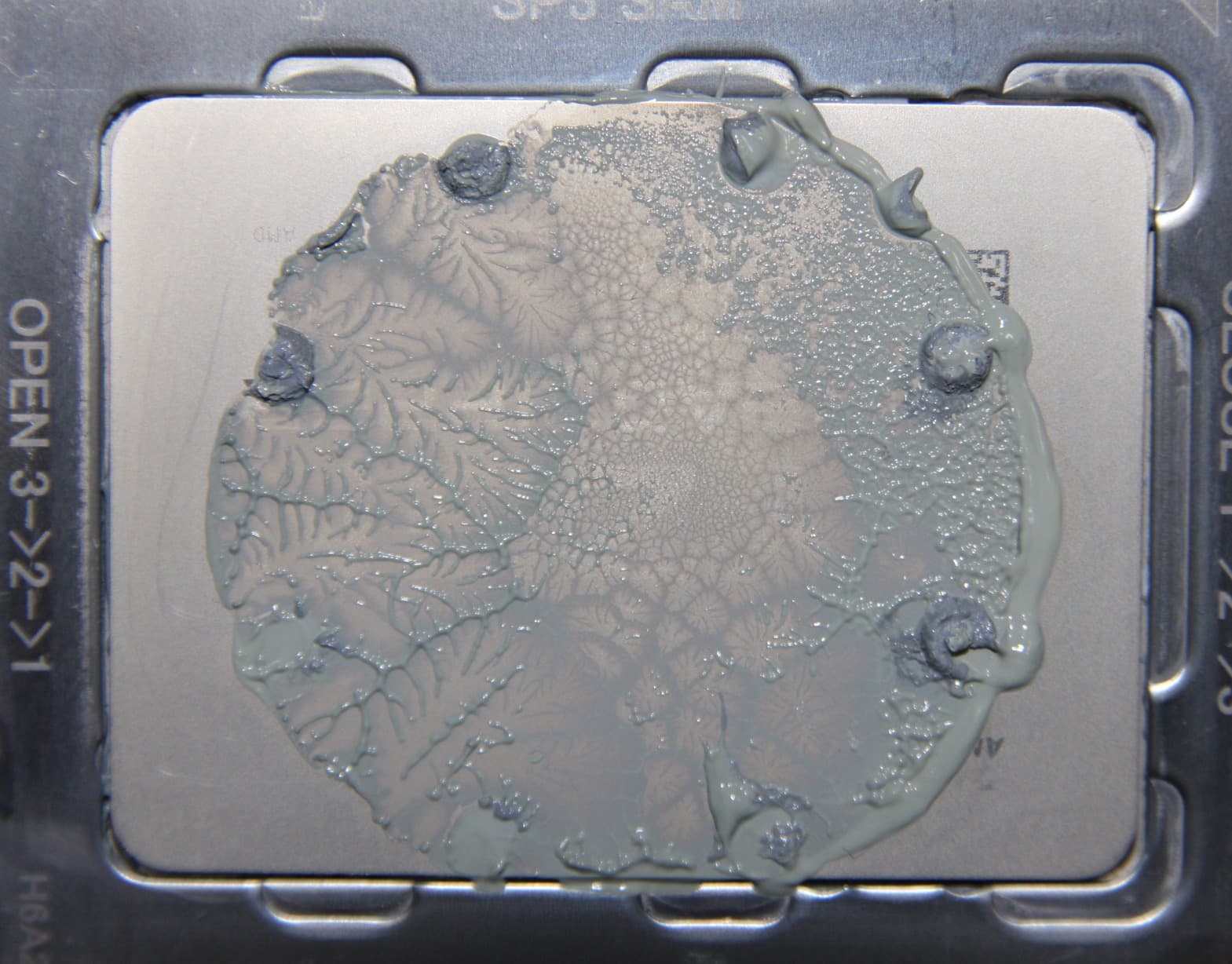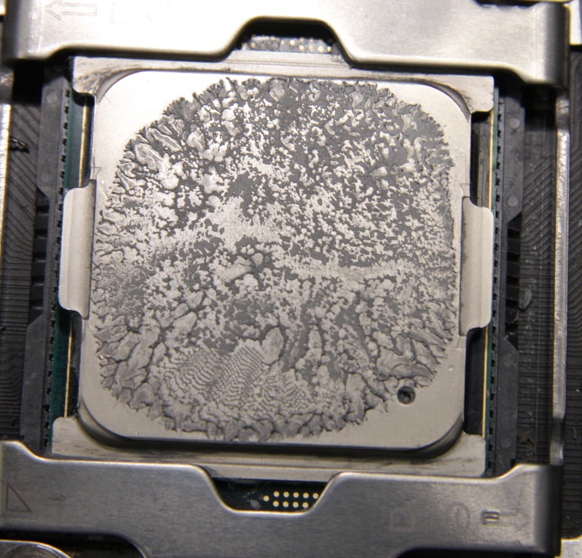 Видно, что термопаста распределилась очень тонким слоем в круге почти до самых краев плоскости крышки процессора, но не попала на углы. Вряд ли это отрицательно сказывается на работе кулера, так как считается, что важнее хорошо охлаждать именно центральную часть крышки процессора.