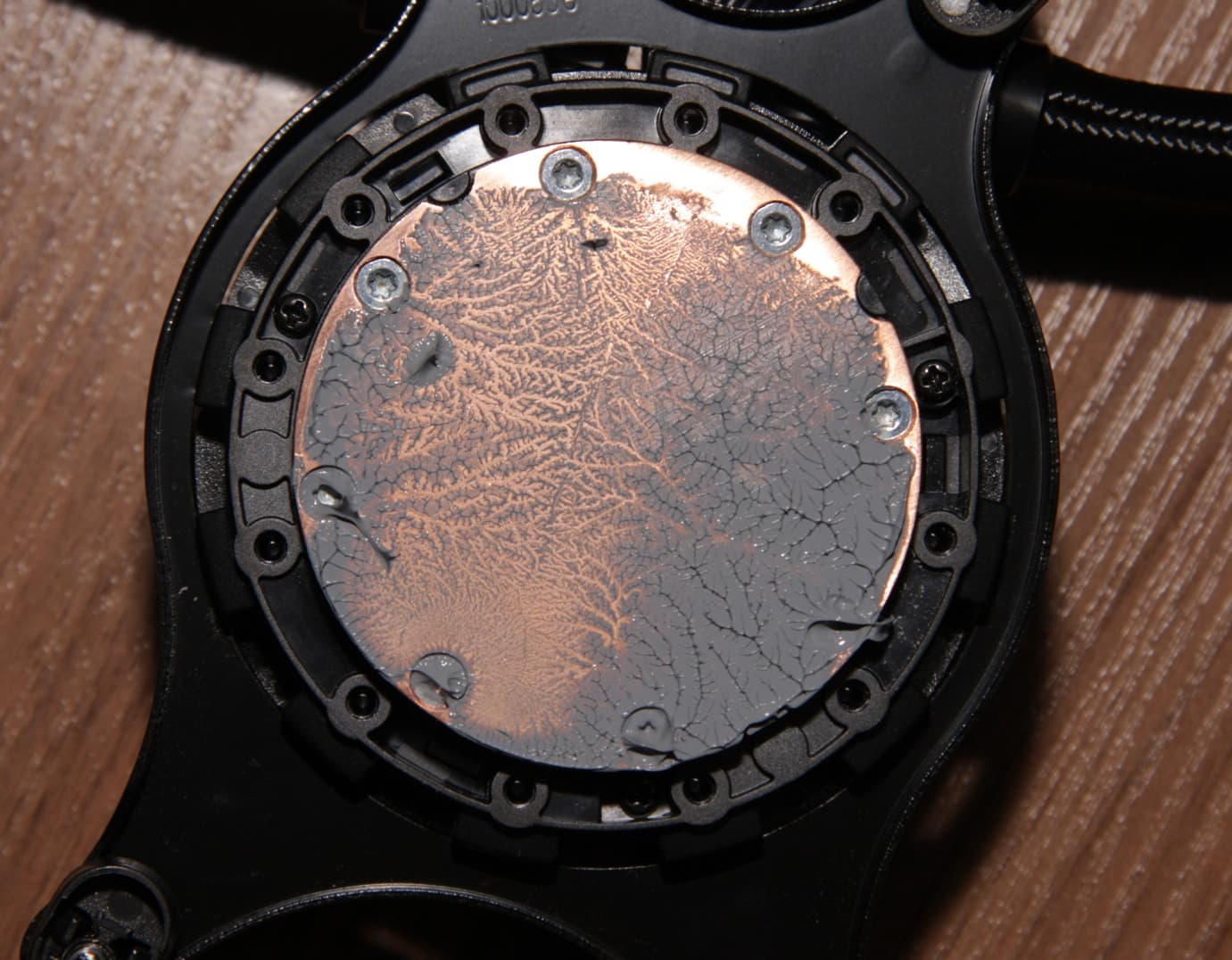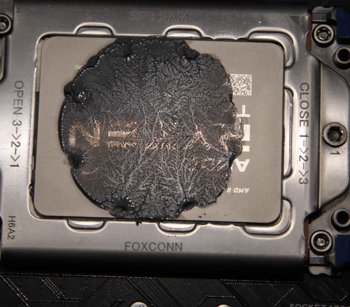 В качестве дополнительного теста мы решили посмотреть, как система Asus ROG Ryuo 240 справится с охлаждением процессора AMD Ryzen Threadripper. Термопасты взяли с избытком, так, что она по возможности заполнила всю рабочую поверхность теплосъемника помпы. Фотографии ниже, сделанные после завершения теста, это демонстрируют. На процессоре: