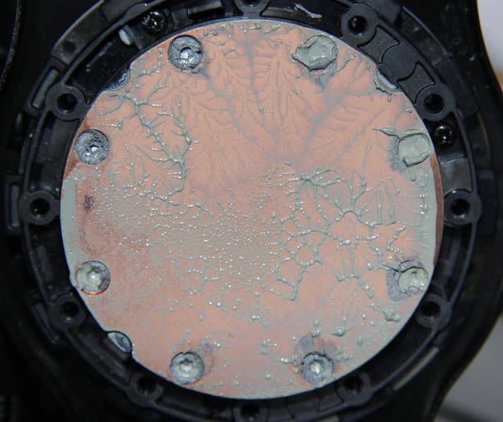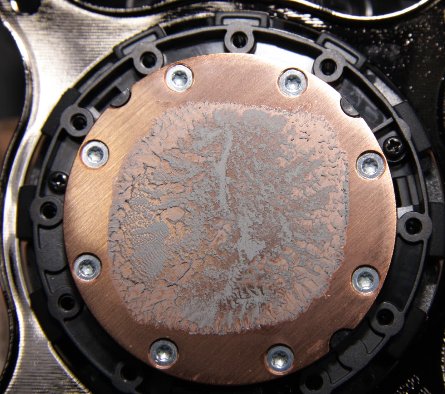 Диаметр этой пластины — 54 мм, а внутренняя часть, ограниченная отверстиями, имеет диаметр примерно 45 мм. Подошва практически идеально плоская. Ее центральную часть занимает нанесенная тонким слоем термопаста. Запаса для ее восстановления в комплекте поставки, к сожалению, нет. Забегая вперед, продемонстрируем распределение термопасты после завершения всех тестов. На процессоре: