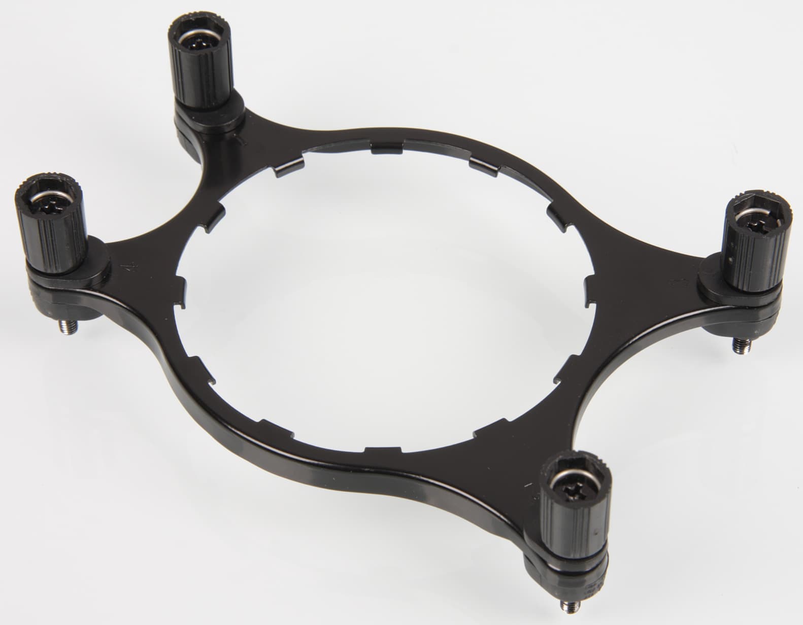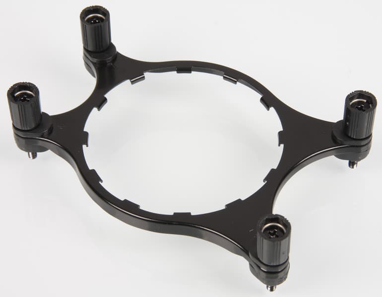 Крепеж изготовлен в основном из закаленной стали и имеет стойкое гальваническое покрытие. Рамка на обратную сторону системной платы изготовлена из пластика, впрочем, резьбовые отверстия в ней все равно в металлических втулках. Отметим большие гайки с накаткой, благодаря которым нет особой необходимости использовать инструменты при установке помпы на процессор.