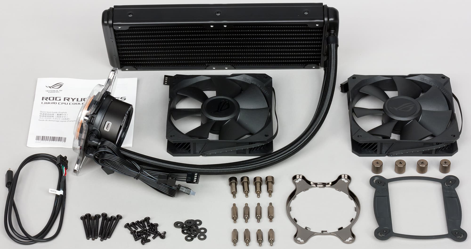 Внутри коробки находятся радиатор с подключенной помпой, вентиляторы, кабель USB, комплект крепежа и инструкция по установке.