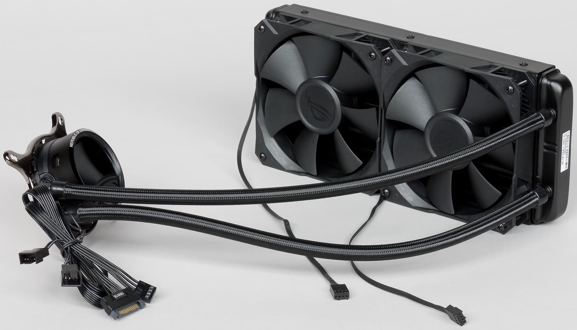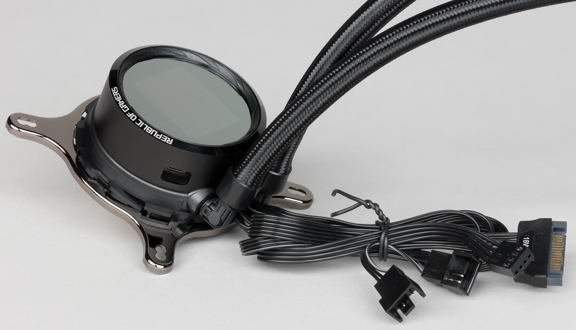 Кабель питания собственно помпы оснащен четырехконтактным разъемом (общий, питание, датчик вращения и управление ШИМ) и имеет длину 32 см. Его предлагается вставить в трех-/четырехконтактный разъем для процессорного кулера или специальный разъем для помпы на мат. плате. Отметим, что управление вращением помпы с помощью ШИМ встречается редко. Вентиляторы подключаются к ответным разъемам на кабеле, выходящем из корпуса помпы. С помощью ШИМ управляются оба вентилятора, но скорость вращения отслеживается только у одного, у того, который подключен к первому разъему со всеми четырьмя контактами. Длина кабеля от помпы до первого разъема для вентилятора равна 30 см плюс до второго разъема еще 5,5 см. Питание для работы вентиляторов подается на помпу с разъема под ответную часть разъема питания для SATA-устройств (это гораздо удобнее, чем к периферийному разъему питания («типа Molex»)) . Длина этого кабеля равна 34 см. Отдельный USB-кабель длиной 85,5 см, подключаемый к помпе, соединяет ее с разъемом внутреннего USB на материнской плате.