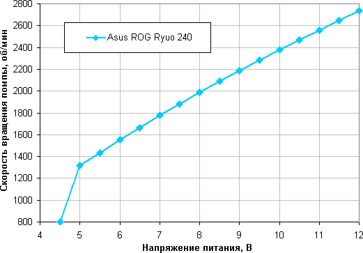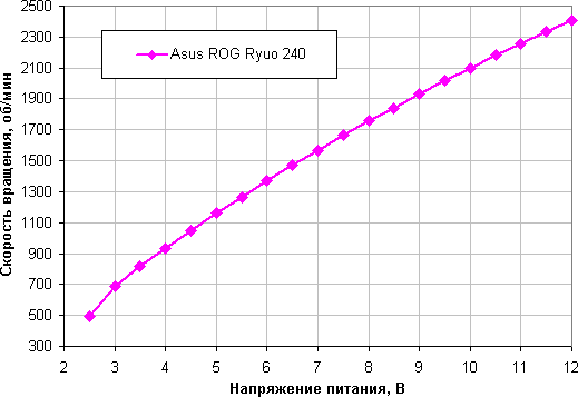 Изменение скорости вращения также плавное, но диапазон регулировки с помощью напряжения чуть-чуть шире. Вентиляторы останавливаются при 2,4 В, а при 2,5 В запускаются. Видимо, в случае необходимости их допустимо подключать к 5 В.