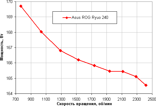 Достоверность значений температуры в области 47-48 °C в данном случае вызывает большие подозрения. Однако в любом случае наш процессор с TDP 180 Вт не перегревается (при 24 градусах окружающего воздуха) даже на минимальных оборотах вентиляторов, достигаемых только с помощью изменения КЗ ШИМ. Это неожиданный результат, учитывая размеры и размещение кристаллов процессора и размеры теплосъемника помпы (см. статью про СВО Thermaltake Floe Riing RGB 280 TT Premium Edition и Floe Riing RGB 360 TT Premium Edition). Посмотрим на зависимость потребляемой процессором мощности (в сумме по двум разъемам 12 В для питания процессора) от скорости вращения вентиляторов: