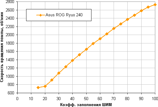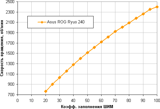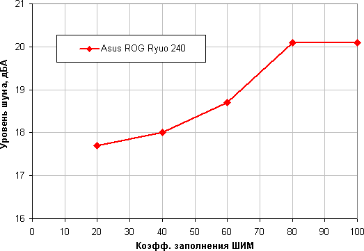 Отличный результат — широкий диапазон регулировки и плавный рост скорости вращения при изменении коэффициента заполнения от 20% до 100%. Отметим, что при КЗ 0% вентиляторы не останавливаются, поэтому в гибридной системе охлаждения с пассивным режимом на минимальной нагрузке такие вентиляторы придется останавливать, снижая напряжение питания.
