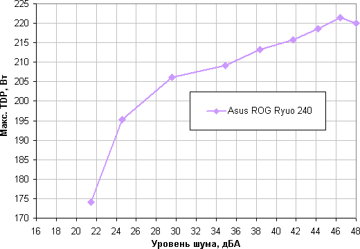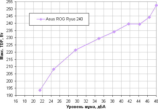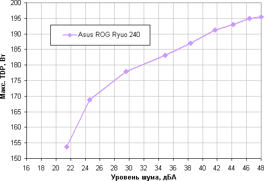 Приняв 25 дБА за критерий условной бесшумности, получим, что примерная максимальная мощность процессора, соответствующего этому уровню, составляет порядка 195 Вт. Если не обращать внимания на уровень шума, то предел мощности можно увеличить где-то до 220 Вт. Еще раз уточним: это в жестких условиях обдува радиатора нагретым до 44 градусов воздухом. При снижении температуры воздуха указанные пределы мощности для бесшумной работы и максимальной мощности возрастают.