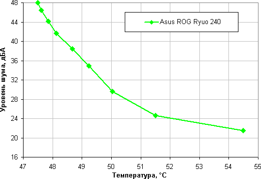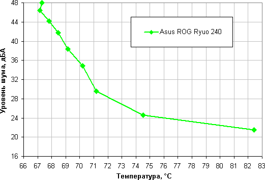 Зависимость уровня шума от температуры процессора при полной загрузке: