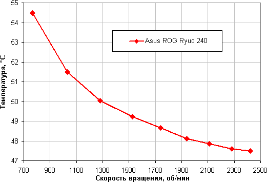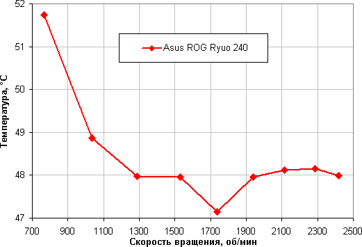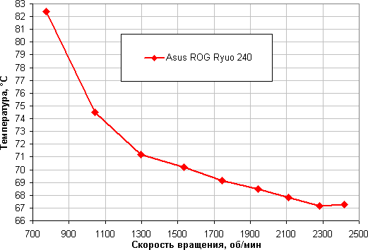 Зависимость температуры процессора AMD Ryzen Threadripper 1920X при его полной загрузке от скорости вращения вентиляторов:
