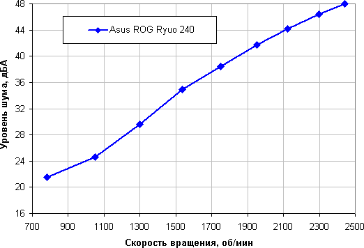Уровень шума этой системы охлаждения меняется в широком диапазоне. Зависит, конечно, от индивидуальных особенностей и других факторов, но где-то от 40 дБА и выше шум, с нашей точки зрения, очень высокий для настольной системы; от 35 до 40 дБА уровень шума относится к разряду терпимых; ниже 35 дБА шум от системы охлаждения не будет сильно выделяться на фоне типичных небесшумных компонентов ПК — корпусных вентиляторов, вентиляторов на блоке питания и на видеокарте, а также жестких дисков; а где-то ниже 25 дБА кулер можно назвать условно бесшумным. В данном случае охватывается весь указанный диапазон, то есть в зависимости от скорости вращения вентиляторов система может быть как очень шумной, так и очень тихой. На практике не может быть и речи о том, чтобы использовать эту систему в домашнем компьютере, когда вентиляторы работают на максимальной скорости, — слишком шумно будет. Во время измерений фоновый уровень был равен 17,3 дБА (условное значение, которое показывает шумомер). Уровень шума только от помпы равен примерно 20 дБА. При желании можно снизить КЗ или напряжение питания помпы, что уменьшит общий шум от системы в случае малых скоростей вращения вентиляторов, но особого смысла в этом нет. Приведем зависимость уровня шума только помпы от КЗ .