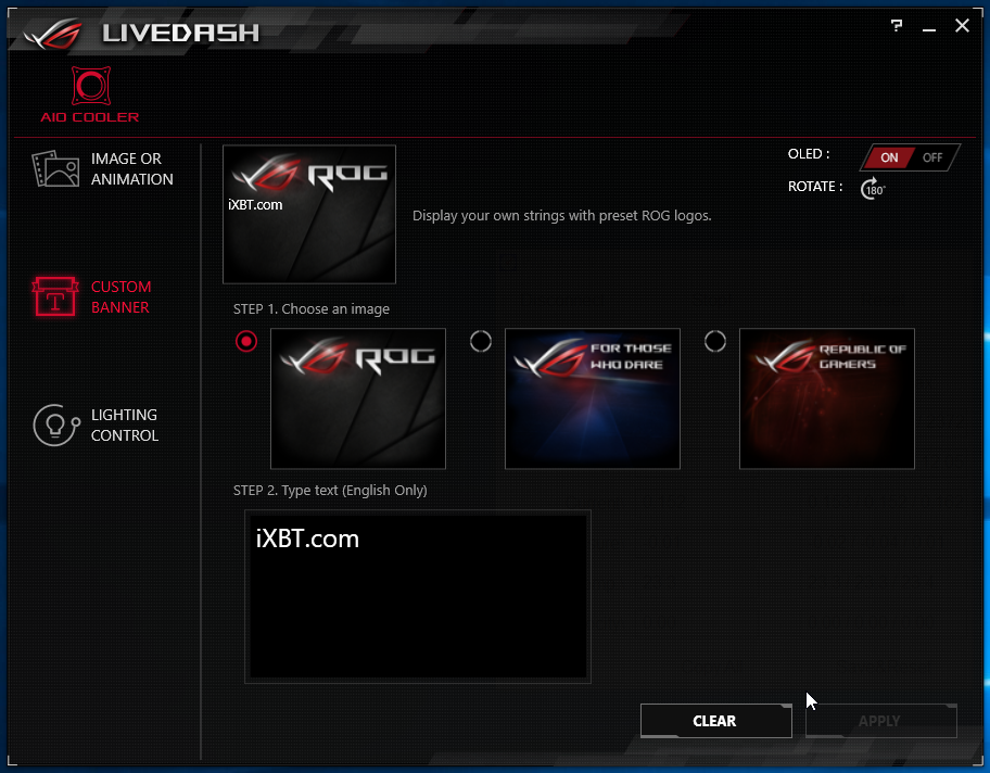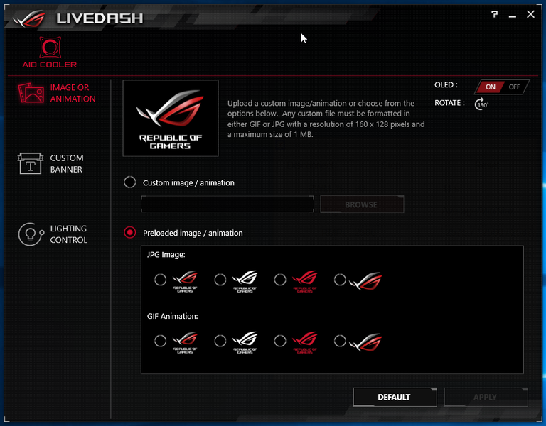 Список в левой части главного окна позволяет выбрать режим работы экрана и ободка. На экран можно вывести предустановленные варианты статического изображения (JPG) или динамического (GIF). Картинку можно загрузить и свою (GIF или JPG размером 160×128 и до 1 МБ). Свою статическую картинку загрузить нам удалось с первой попытки. С динамической все тоже получилось, хотя и не сразу. Ее загрузка начиналась, но почти сразу прекращалась. Мы уже решили, что не судьба, но через какое-то время при повторном включении системы на экранчике наше изображение все-таки появилось (музыка: Bensound’s Royalty Free Music):