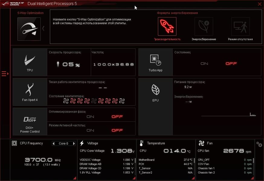 Опять же, только в случае материнских плат Asus работой системы Asus ROG Ryuo 240 можно управлять с помощью ПО Dual Intelligent Processors 5 (устанавливается с помощью AI Suite III). Производитель явно постарался убедить пользователя в том, что использовать Asus ROG Ryuo 240 нужно именно на материнских платах этой же марки. Это ПО имеет множество функций, связанных с мониторингом и управлением работы ПК).