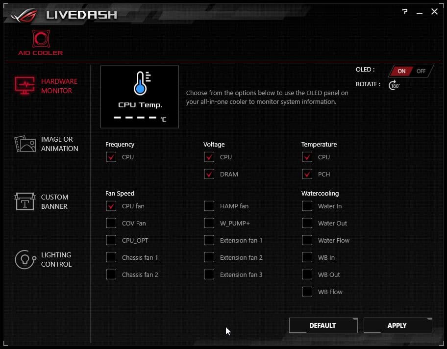 Только в случае материнских плат компании Asus на дисплей помпы можно вывести данные с датчиков мониторинга системы. Выбрать можно до пяти датчиков, и если выбрано более одного датчика, то данные будут выводится попеременно, по несколько секунд на одно значение. Доступные для демонстрации датчики в случае материнской платы Asus ROG Zenith Extreme отмечены галочками на снимке ниже (это без установки дополнительных вентиляторов, плат расширения или датчиков температуры).