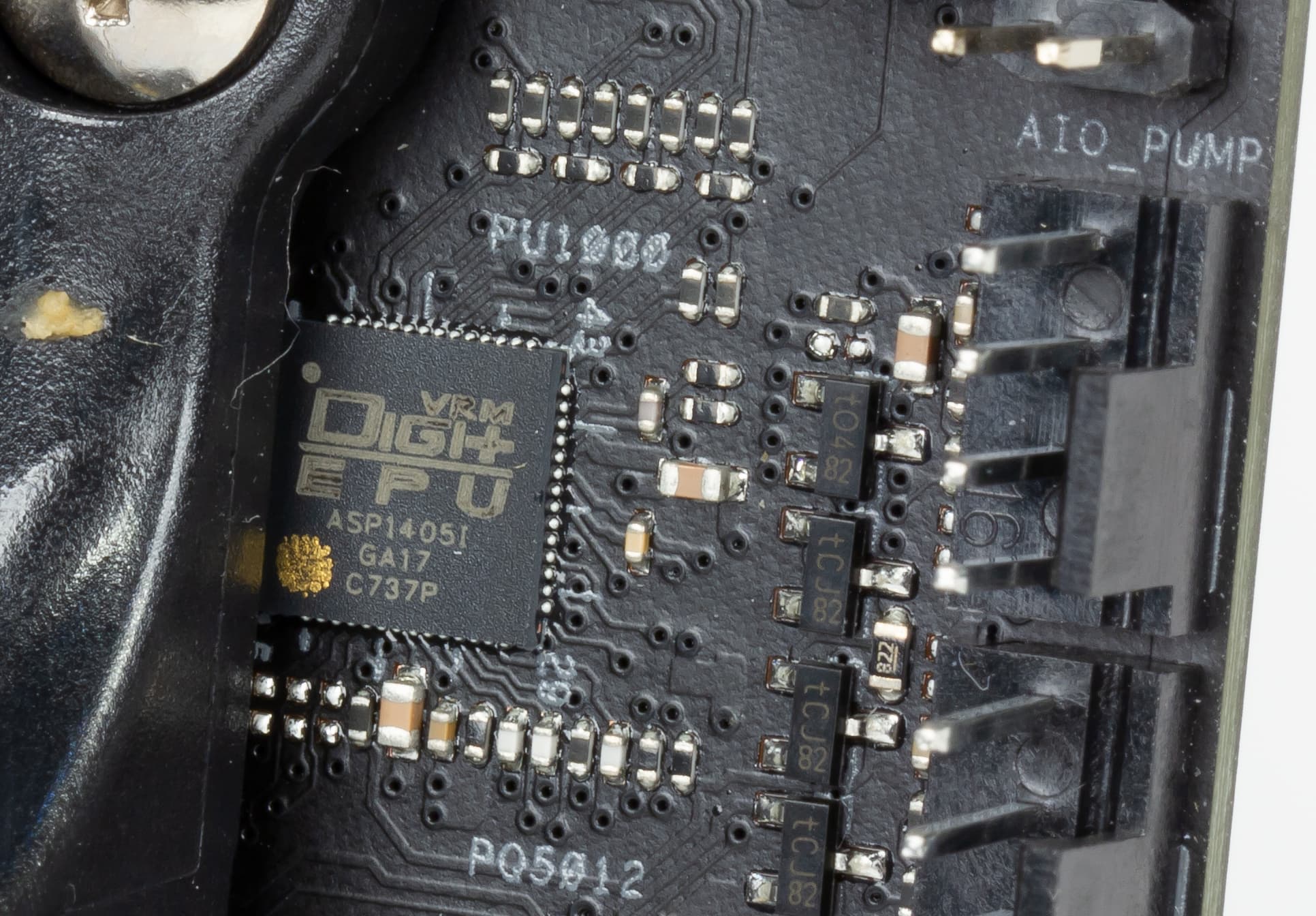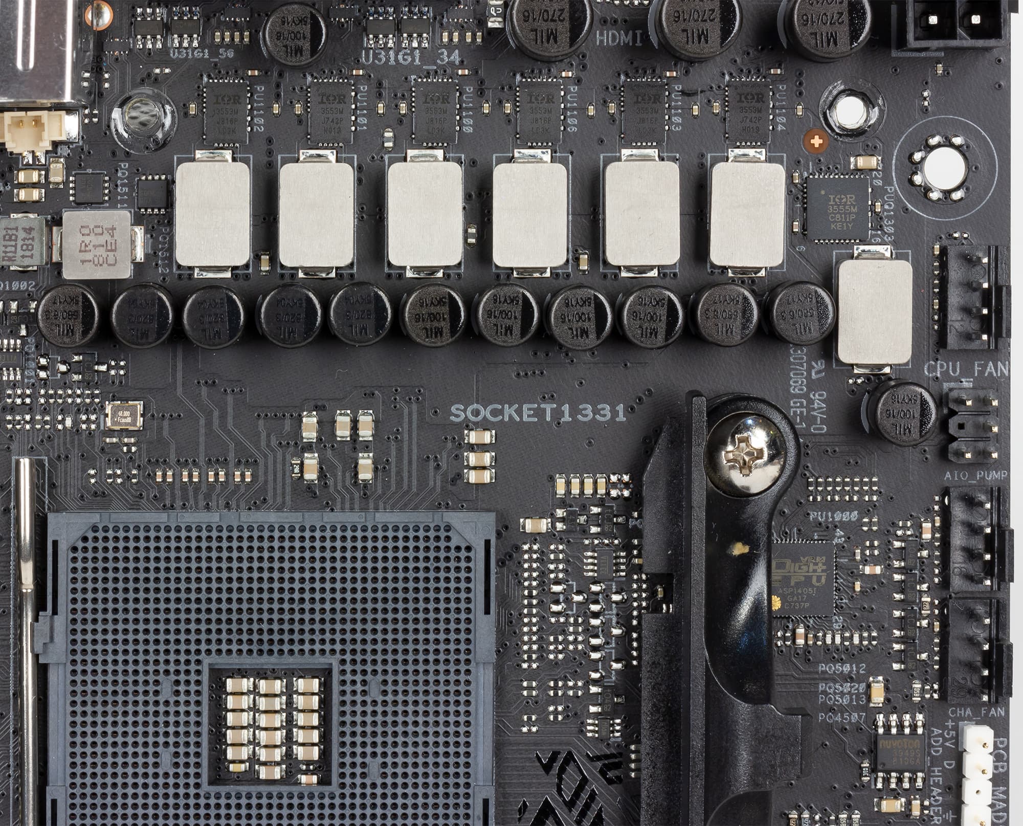 Регулятор напряжения питания процессора в данном случае шестиканальный и основан на PWM-контроллере Digi+ VRM c маркировкой ASP1405I. В каждом канале питания используются чипы Infineon Technologies IR3553M, объединяющие в себе MOSFET-транзисторы и MOSFET-драйвер.