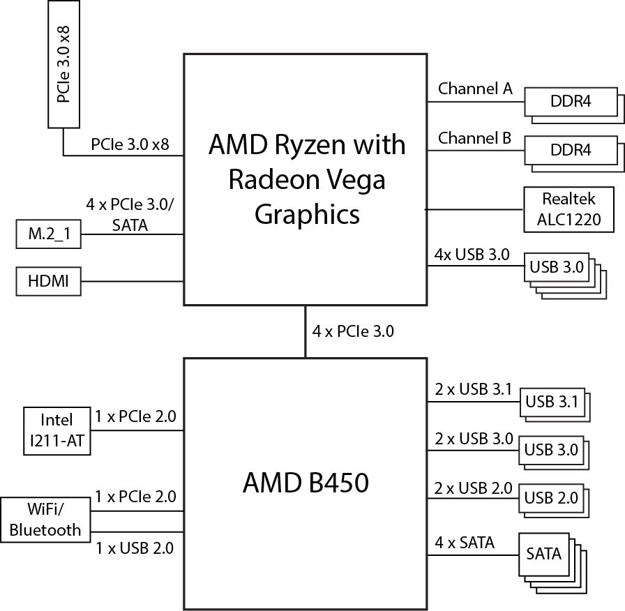 Начнем, пожалуй, с процессоров. Особенность AMD Ryzen заключается в том, что в них частично интегрирован традиционный южный мост чипсета: контроллер PCIe 3.0, контроллер USB 3.0 и контроллер SATA. Кроме того, есть процессоры семейства Ryzen без интегрированного графического ядра, а есть и с графикой (APU Ryzen with Radeon Vega Graphics). Помимо наиболее очевидного отличия, разница между ними еще и в том, что эти процессоры имеют разное количество линий PCIe 3.0.