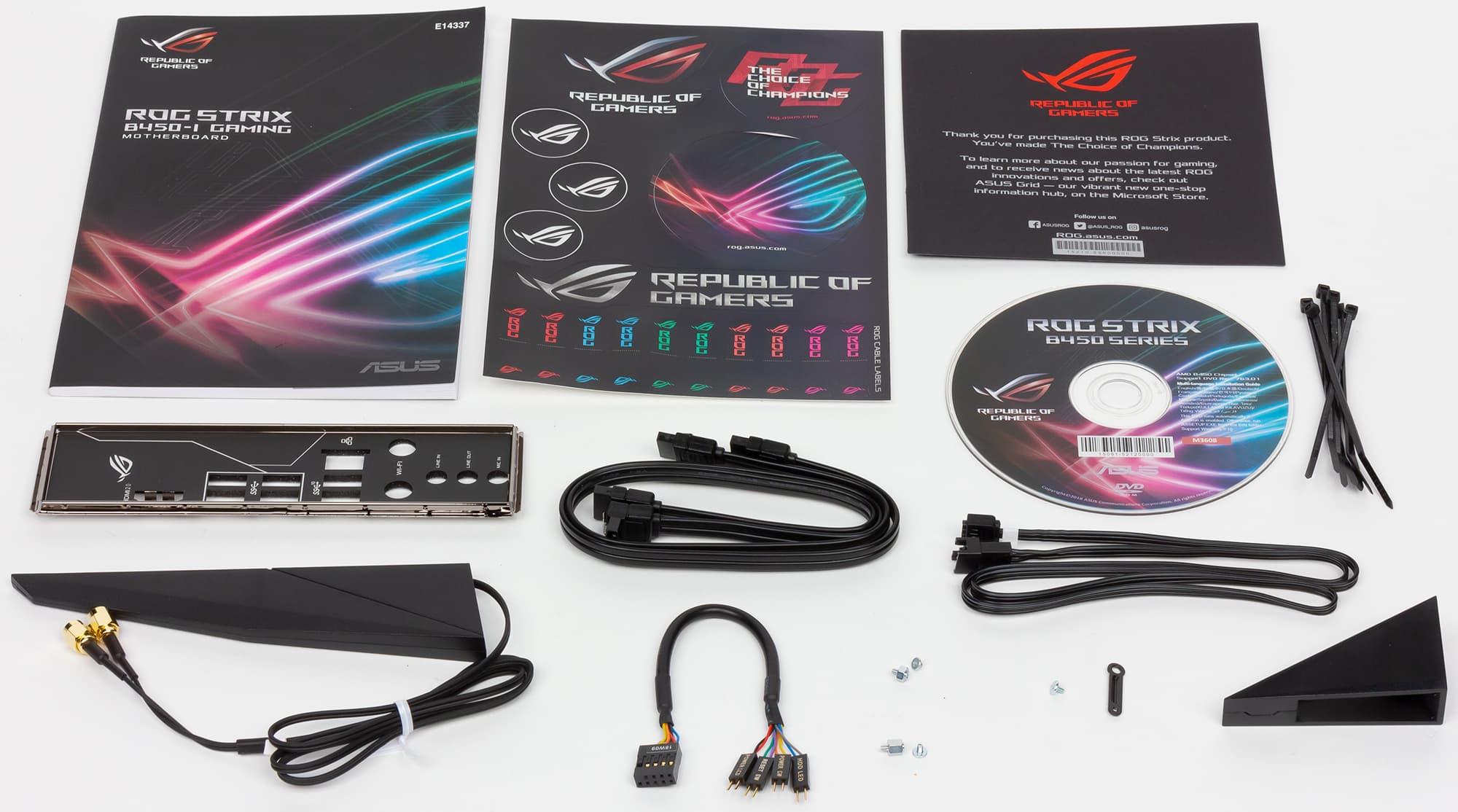 Комплект поставки включает в себя руководство пользователя, два SATA-кабеля (все разъемы с защелками, один кабель имеет угловой разъем с одной стороны), DVD-диск с драйверами, антенну для встроенного Wi-Fi-модуля, переходной кабель для подключения светодиодной ленты, кабель для упрощения подключения к плате кнопки питания, перезагрузки и т. д. Кроме того, есть стикеры на все случаи жизни.