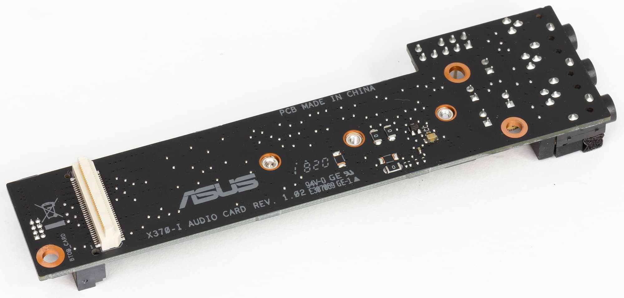 Аудиоподсистема платы основана на HDA-аудиокодеке Realtek ALC1220. Все элементы аудиотракта, как уже было сказано выше, не просто выделены в отдельную зону на PCB, а вообще вынесены на отдельную дочернюю плату. Помимо аудиокодека звуковая подсистема платы включает фильтрующие конденсаторы Nichicon, а также дискретные операционные усилители Texas Instruments RC4850 и OPA O1688A.