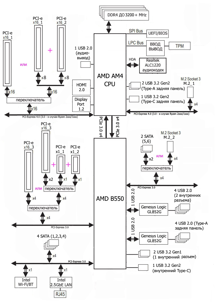 В свою очередь чипсет B550 поддерживает в сумме 18 линий PCI-e 3.0. Из них опять же 4 нужны для связи с CPU. Осталось 14 линий ввода-вывода, из которых 4 заняты портами SATA, а остальные 10 линий могут свободно конфигурироваться. Понятно, что скорее всего будет дефицит линий PCI-e для размещения всей нужной периферии, и придется делить ресурсы.