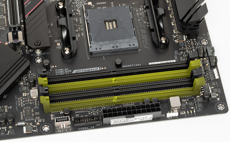 Для установки модулей памяти на плате ROG имеется четыре DIMM-слота (для работы памяти в Dual Channel в случае использования всего 2 модулей их следует устанавливать в А2 и B2). Плата поддерживает небуферизованную память DDR4 (non-EСС), а максимальный объем памяти составляет 128 ГБ (при использовании UDIMM последнего поколения по 32 ГБ). Разумеется, поддерживаются профили XMP.
