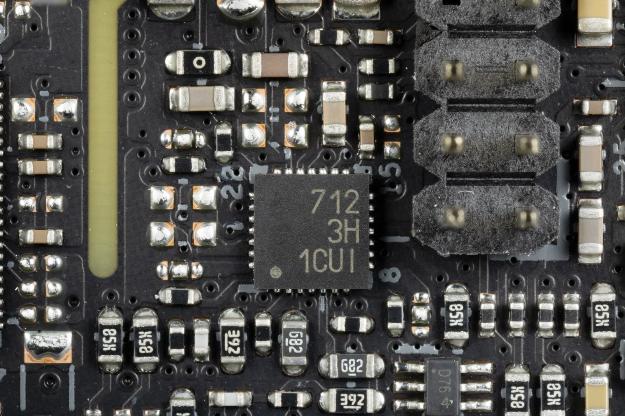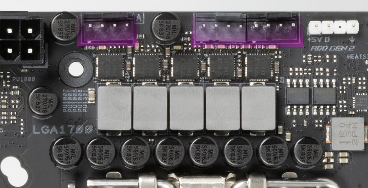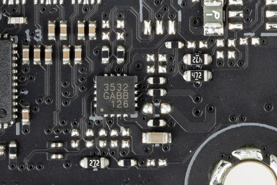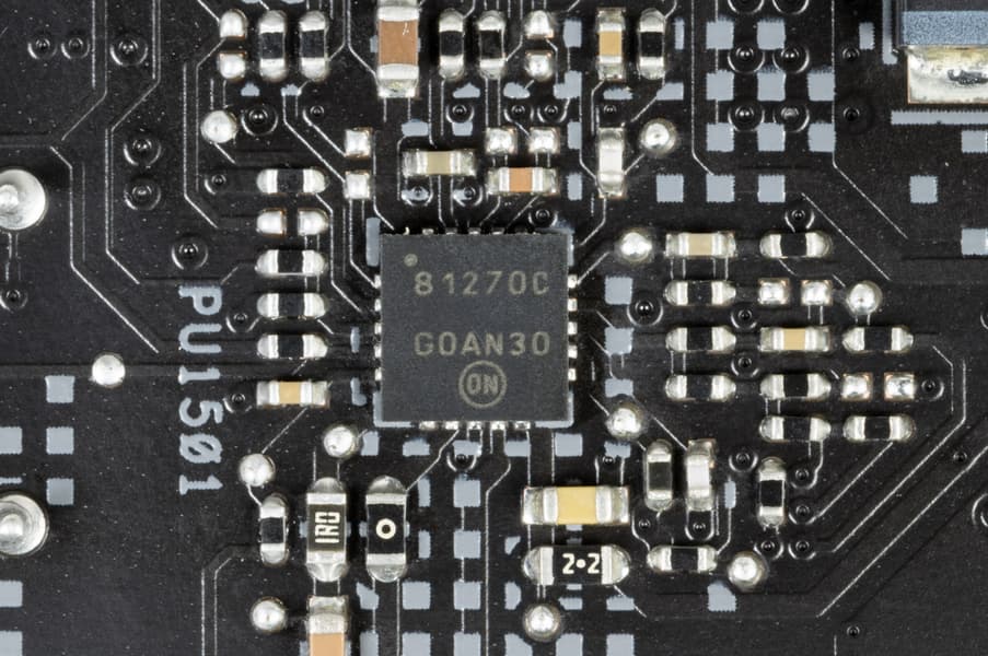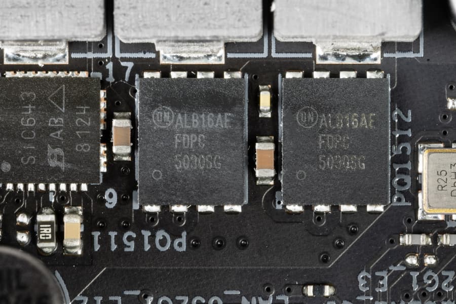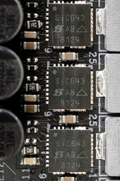 Каждый канал фазы имеет суперферритовый дроссель и SiC643 MOSFET от Vishay на 40 А для VCore и встроенного графического ядра