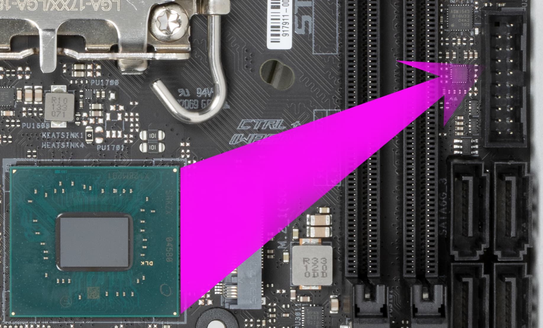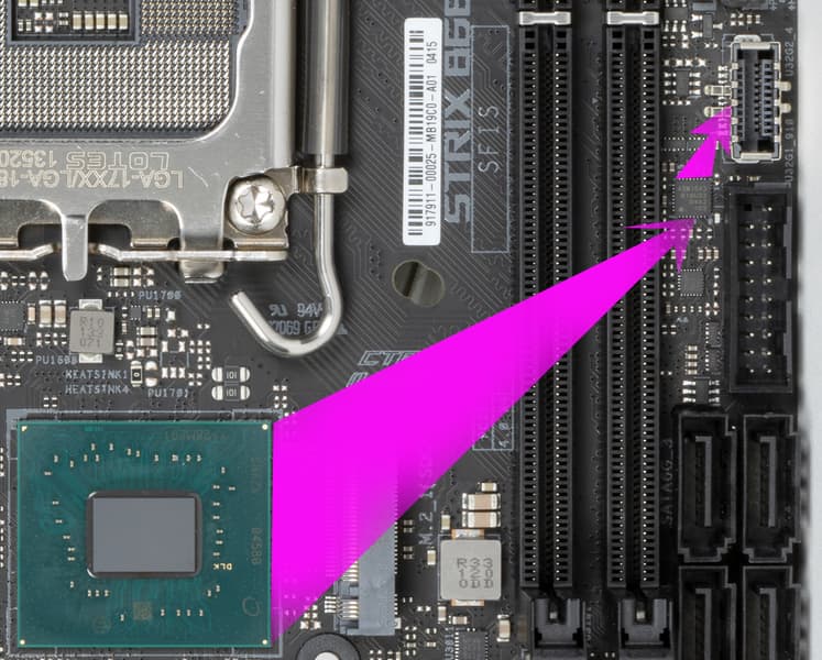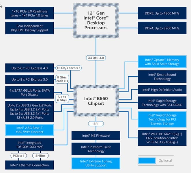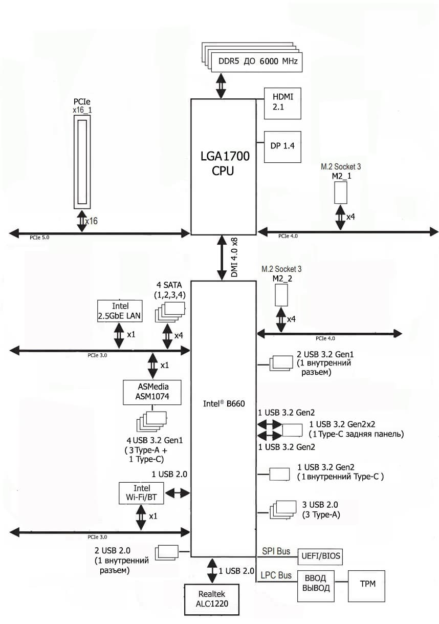 Процессоры Intel Core 12-го поколения (совместимые с сокетом LGA1700 и поддерживаемые B660/Z690) имеют 20 линий ввода-вывода (16 PCIe 5.0, 4 PCIe 4.0), не имеют USB и SATA портов. При этом взаимодействие с B660 идет по особому каналу Digital Media Interface 4.0 (DMI 4.0 x4 (именно х4!)). Все PCIe линии процессора идут на слоты расширения PCIe и порт М.2. Serial Peripheral Interface (SPI) используется для взаимодействия с системой UEFI/BIOS, а шина Low Pin Count (LPC) — для связи с устройствами ввода/вывода, не требующими высокой пропускной способности (контроллерами вентиляторов, TPM, старой периферии).
