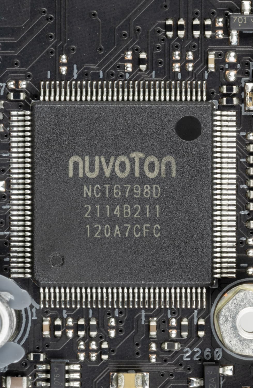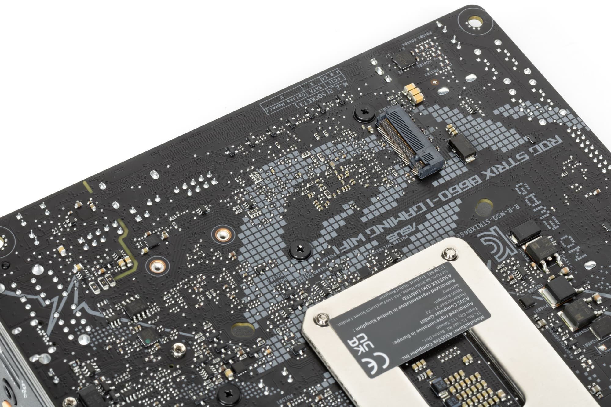 Оборотная сторона — не пустая, там расположена некоторая логика, а также размещен слот для SSD-накопителей в форм-факторе M.2. Текстолит обработан хорошо: во всех точках пайки острые концы срезаны.