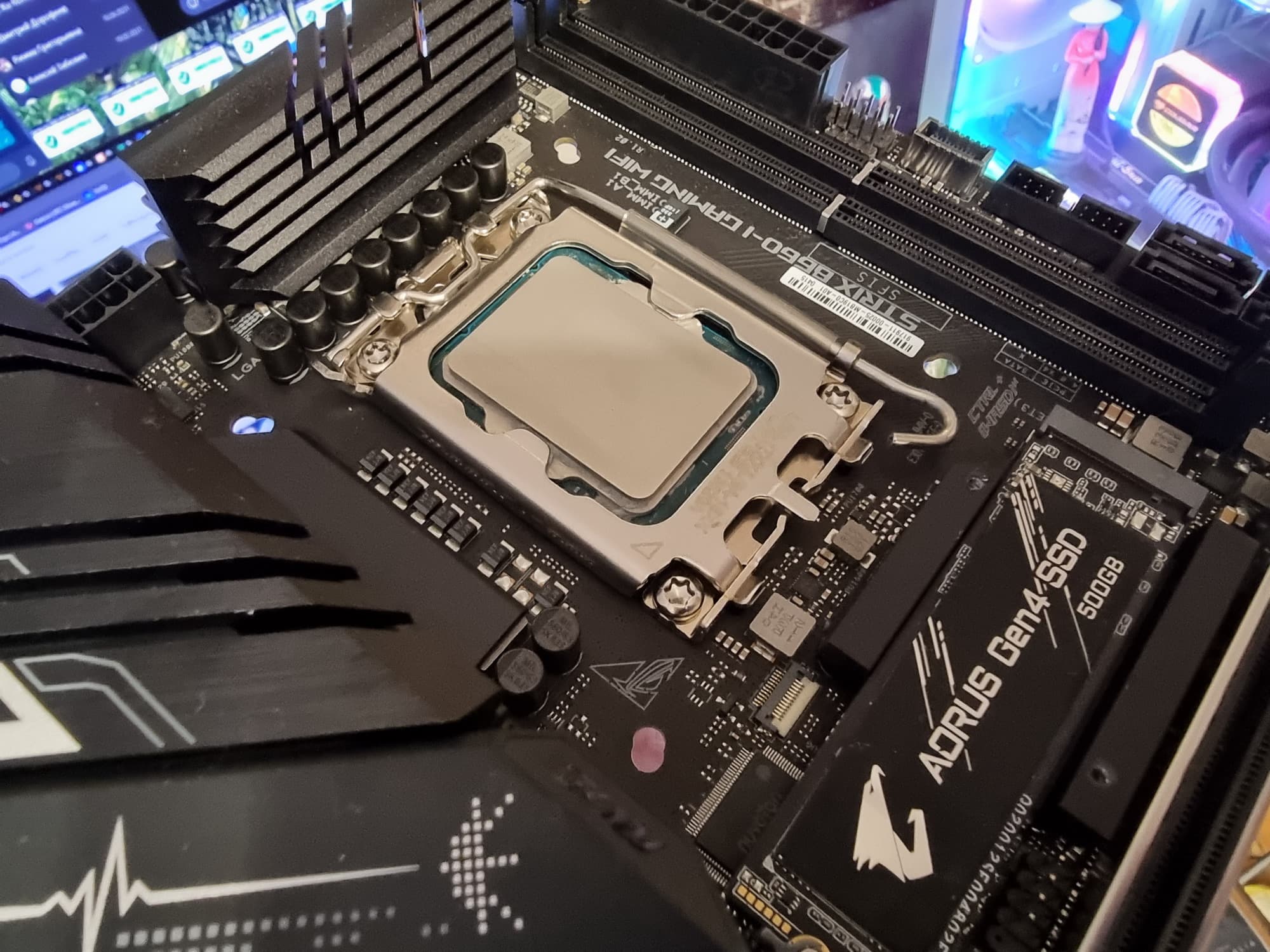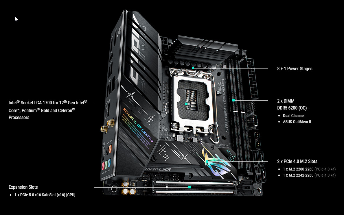 Asus ROG Strix B660-I Gaming WiFi поддерживает процессоры Intel Core 12-го поколения, выполненные под разъем (сокет) LGA1700. Официально система крепления систем охлаждения для CPU несовместима с той, что для LGA1151/1200, однако все же ряд старых СО все же сможет быть применим, лишь придется где-то приобретать или заказывать у производителя комплект крепежа под LGA 1700. Дело в в том, что кулеры с жесткой установкой в матплате на фиксированную высоту могут не достать до 12ххх. Подойдут лишь СО с пружинистой посадкой подошвы на процессор. У данной платы, как и у всех в серии ROG имеются овальные отверстия для монтажа СО с крепежом под LGA 11xx/1200.