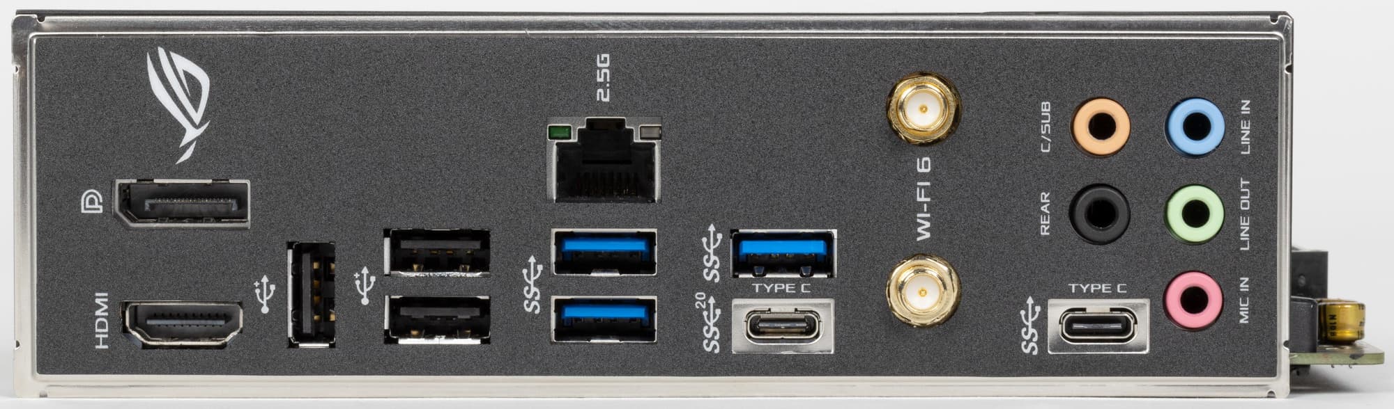 | Разъемы на задней панели | 1 × USB 3.2 Gen2x2 (Type-C) 1 × USB 3.2 Gen1 (Type-C) 3 × USB 3.2 Gen1 (Type-A) 3 × USB 2.0 (Type-A) 1 × RJ-45 5 аудиоразъемов типа миниджек 2 антенных разъема 1 разъем HDMI out 1 разъем Display Port out |