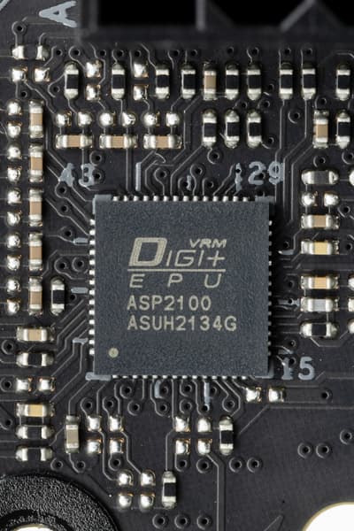 Управляет схемой питания VCore и iGPU фирменный ШИМ-контроллер Digi+ ASP2100.