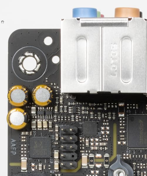Аудиотракт вынесен на угловую часть платы, не пересекается с другими элементами. Все аудиоразъемы на задней панели имеют позолоченное покрытие, а также привычную цветовую окраску.