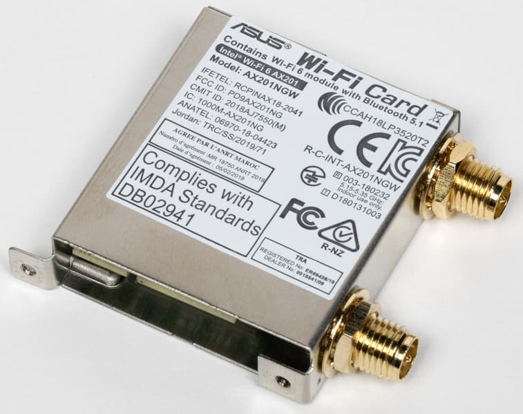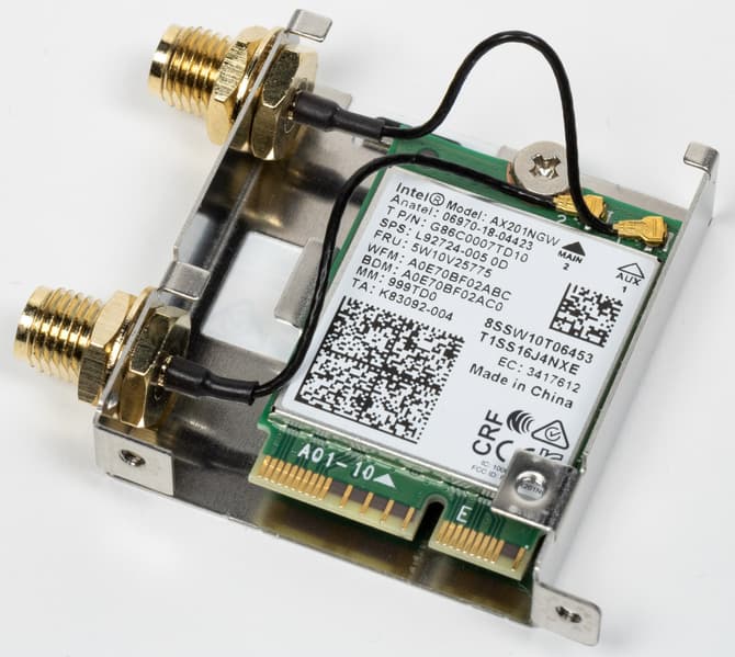 Имеется и комплексный беспроводной адаптер на контроллере Intel AX-201NGW, через который реализованы Wi-Fi 6 (802.11a/b/g/n/ac/ax) и Bluetooth 5.1. Он установлен в слот M.2 (E-key), и его разъемы для привинчивания выносных антенн выведены на заднюю панель.
