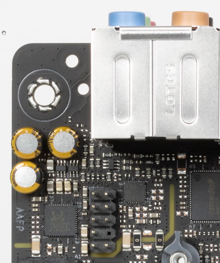 В аудиоцепях платы применяются «аудиофильские» конденсаторы Nichicon Fine Gold.