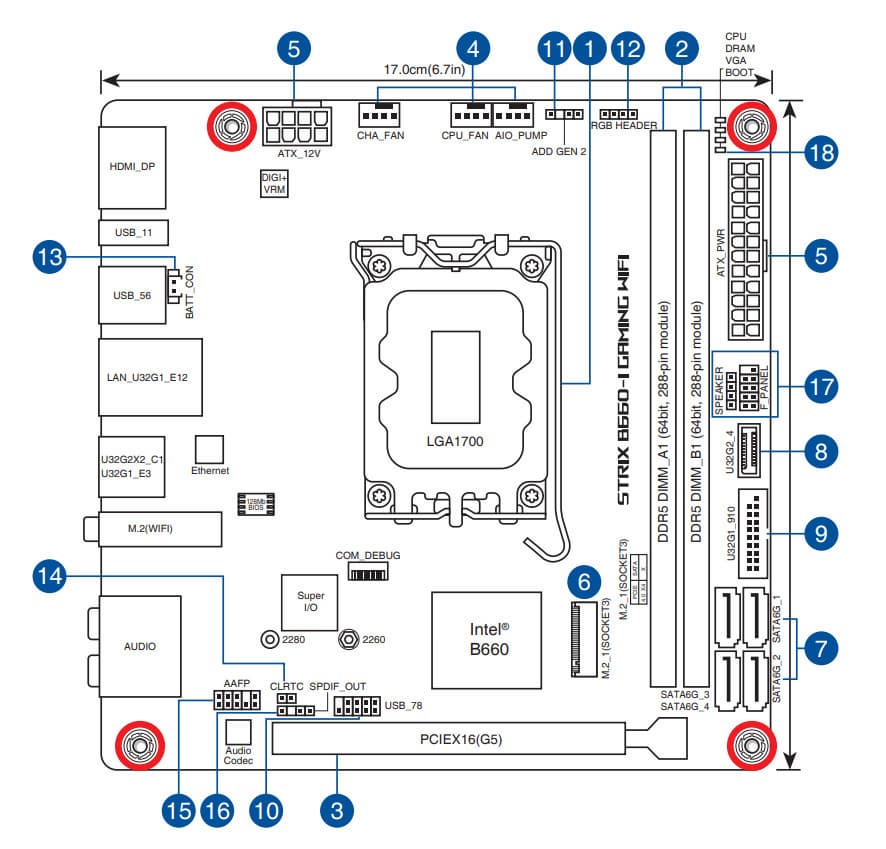 Форм-фактор Mini-ITX имеет размеры 170x170 мм, Micro-ATX до 244×244 мм, ATX до 305×244 мм, а E-ATX — до 305×330 мм. Материнская плата Asus ROG Strix B660-I Gaming WiFi выполнена в форм-факторе Mini-ITX, имеет размеры 170×170 мм, и на ней имеются 4 монтажных отверстия для установки в корпус.