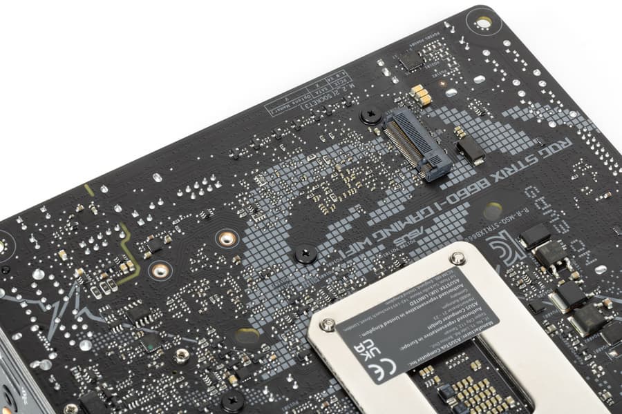 Второй M.2_2 расположен на оборотной стороне матплаты, получает данные от чипсета B660, поддерживая PCIe 4.0, при этом также работает с модулями только с PCIe интерфейсом. Слот поддерживает размеры модулей 2242/2260/2280.