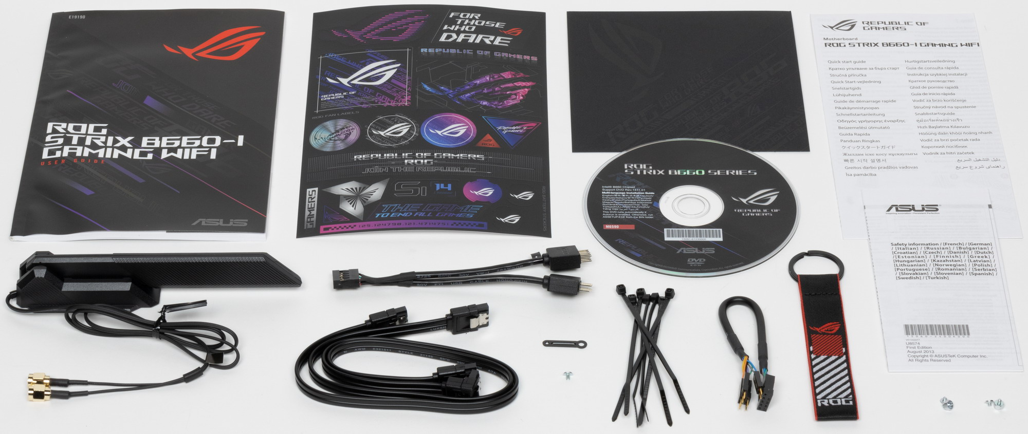 Комплект поставки традиционен для линейки ROG Strix: кроме традиционных элементов типа руководства пользователя и кабелей SATA, имеются накопитель с ПО, антенны встроенного Wi-Fi-модуля, винтики для М.2 слотов, адаптеры для подключения USB-портов и передней панели, а также бонусные стикеры и подарочный брелок.