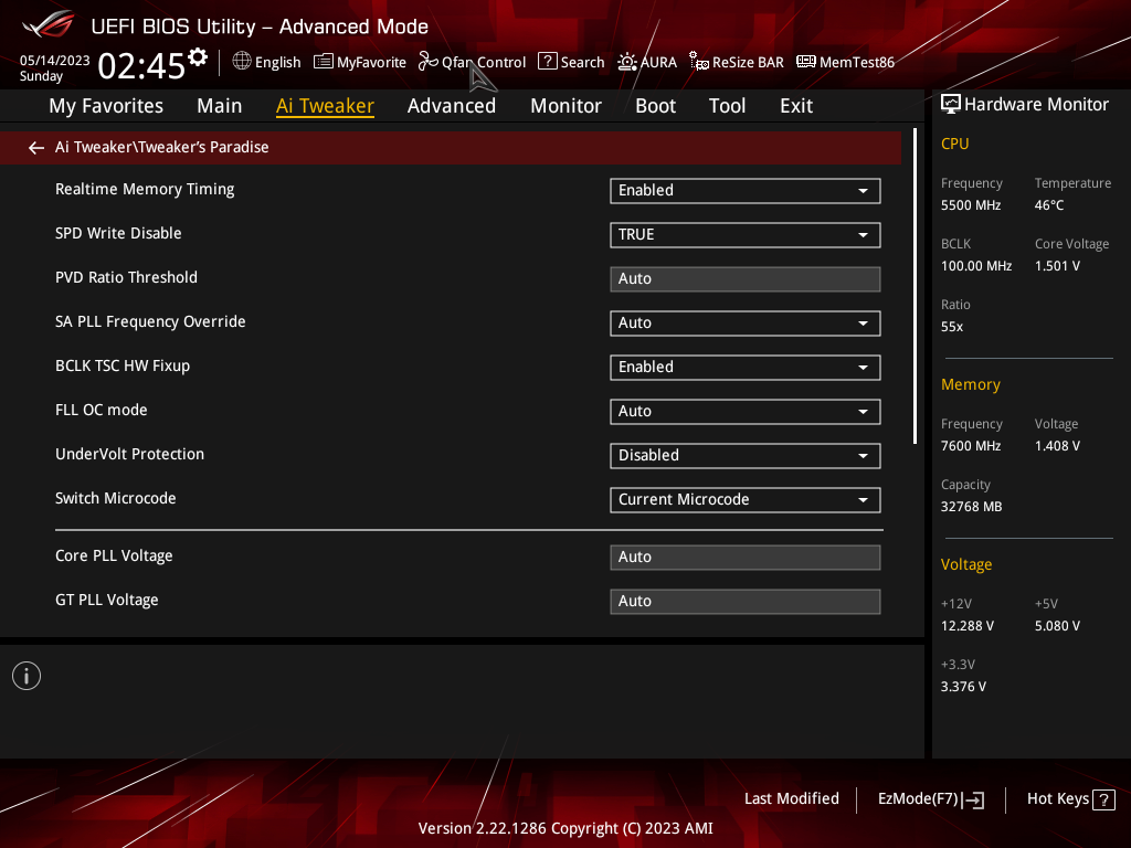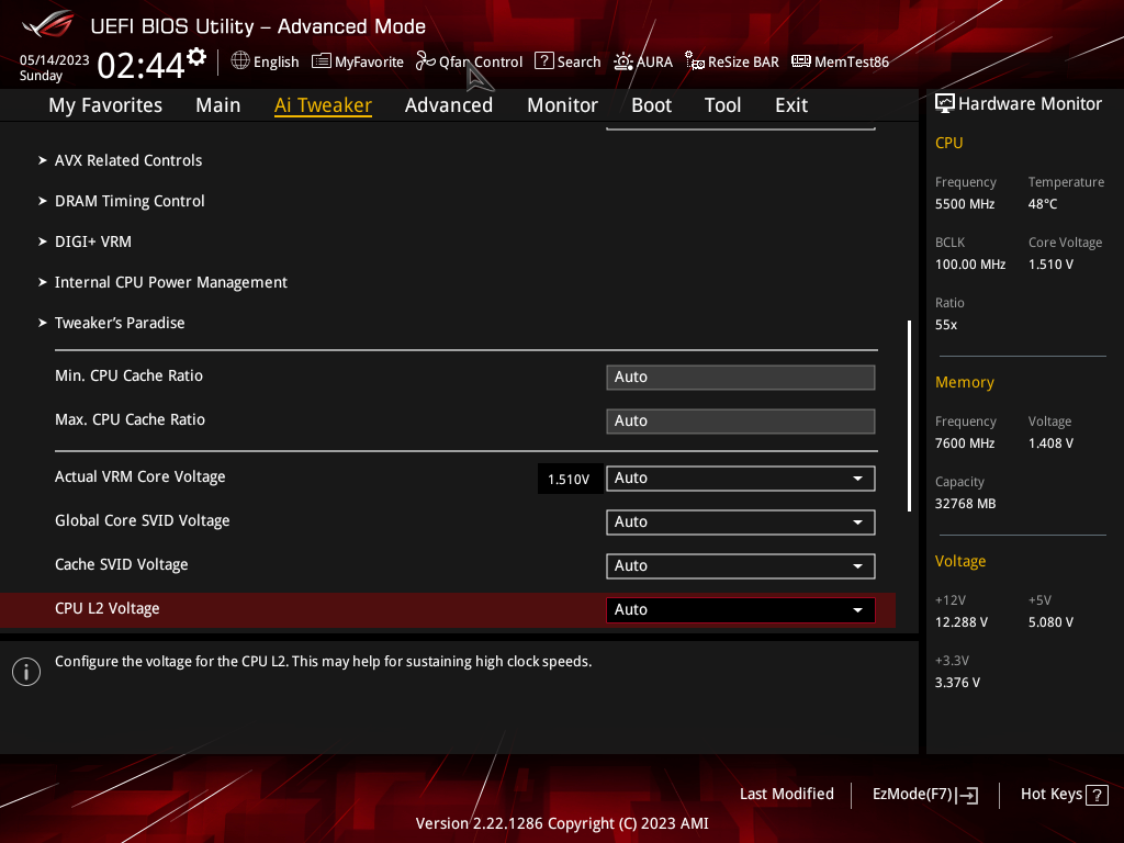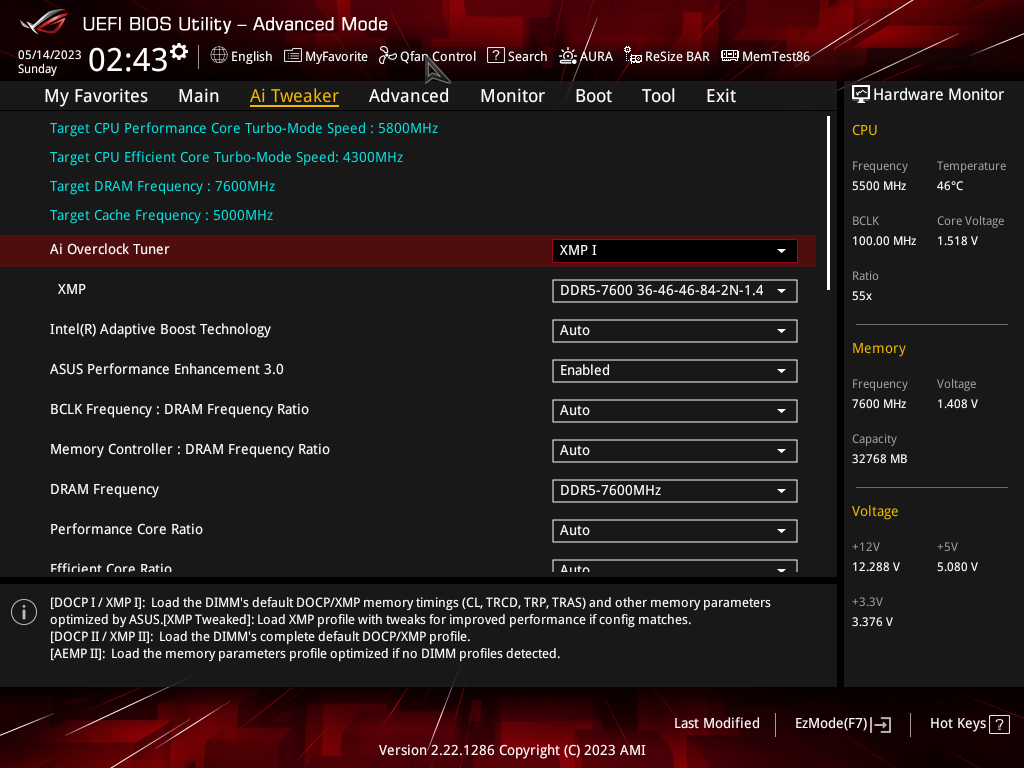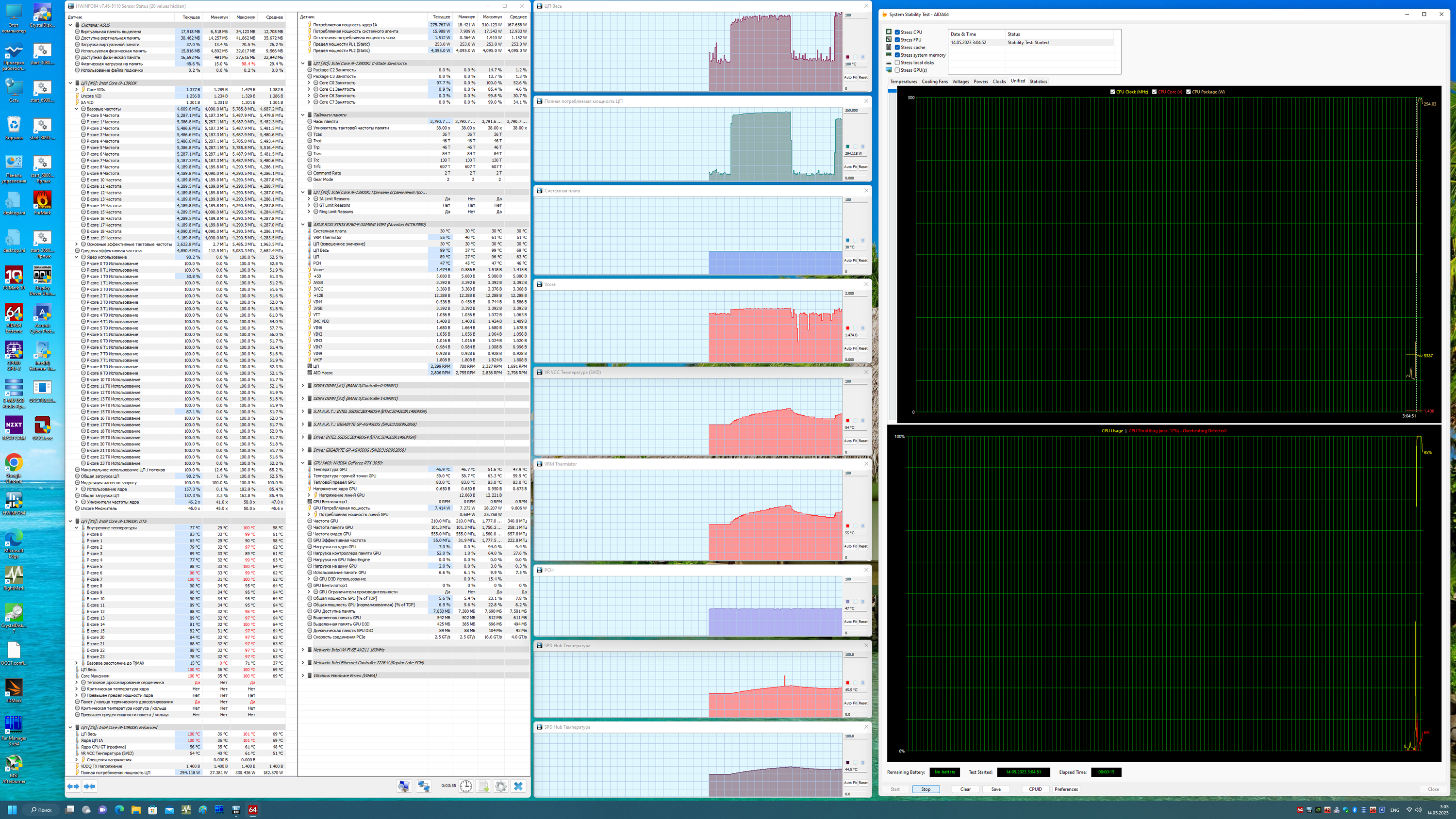 Как мы видим, автоматический разгон даже самого мощного на сегодня 13900К получился приличный: до 5,5/4,3 ГГц. Но при этом даже такая мощная СВО еле справлялась с нагрузкой, работая на максимуме. Причиной тому – завышенный вольтаж на ядре процессора (выше 1.5 В), все же, как показал опыт, выше 1,35 – 1,4 В поднимать не стоит, многие СВО перестанут справляться с нагревом 13900К на очень высоких частотах.