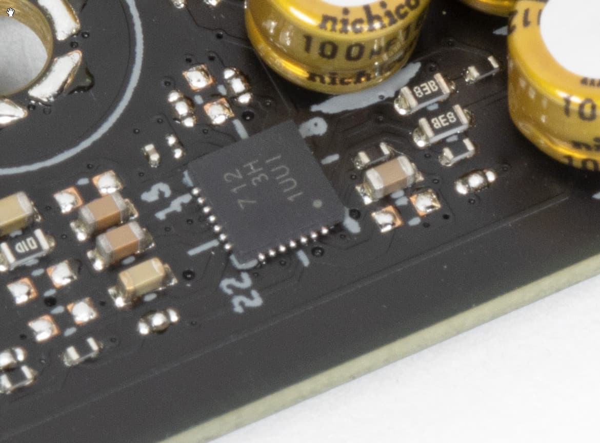 В аудиоцепях платы применяются «аудиофильские» конденсаторы Nichicon Fine Gold.