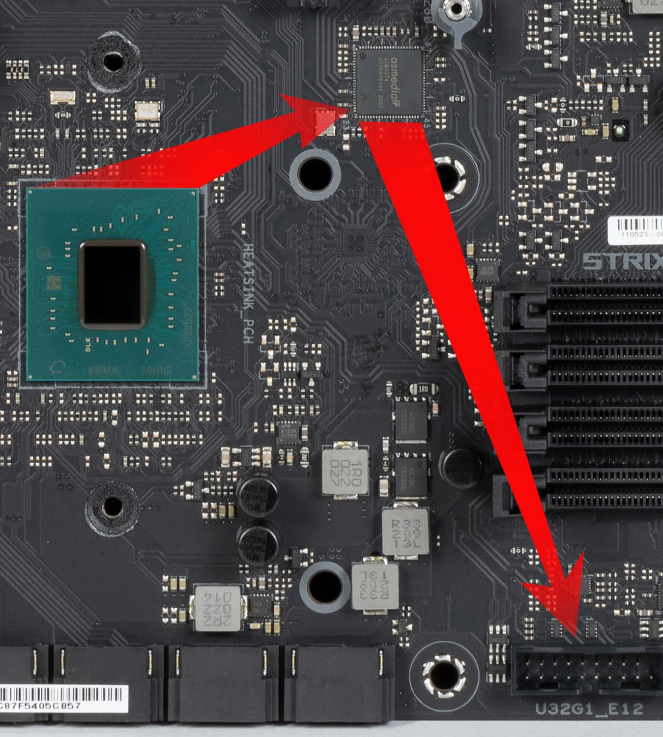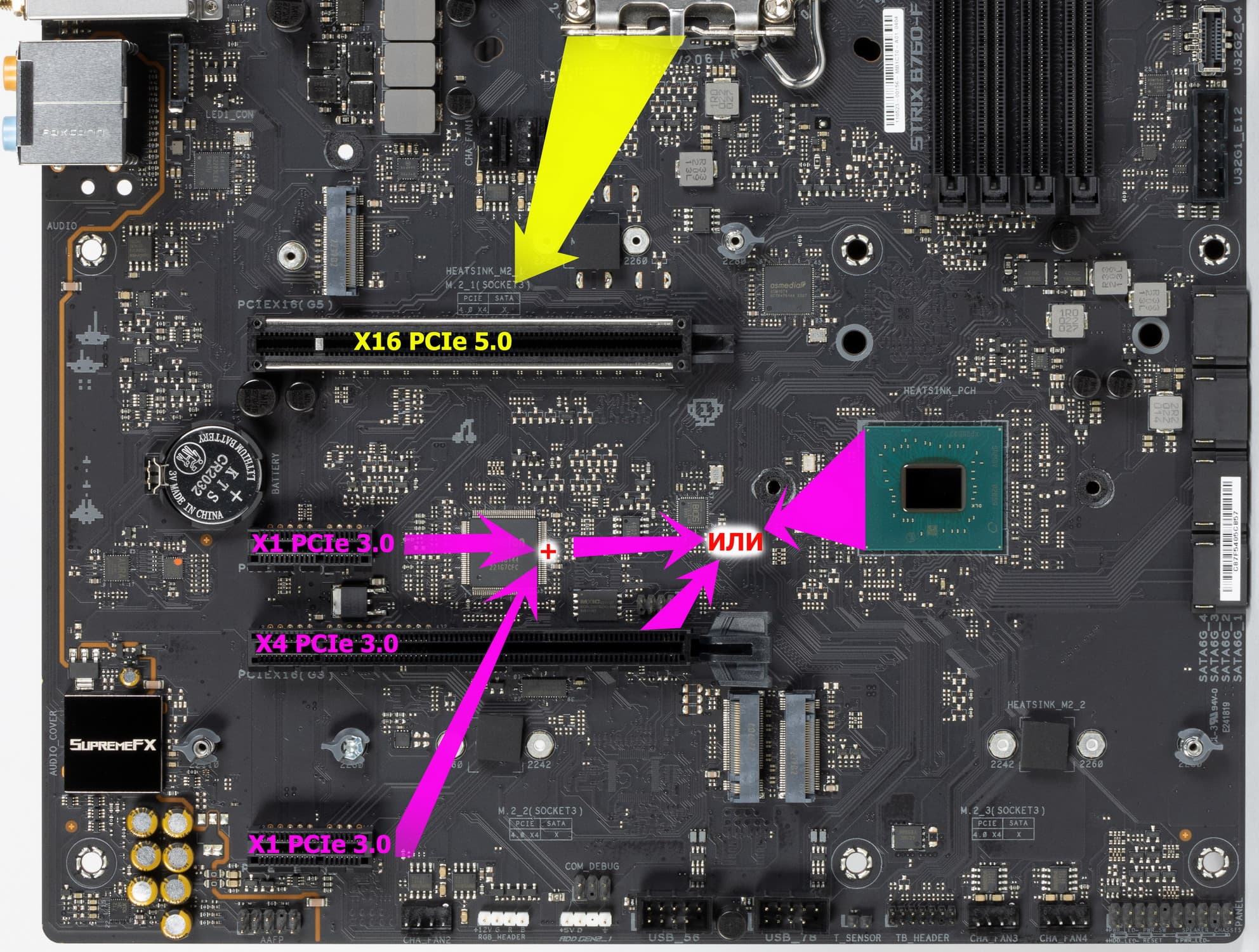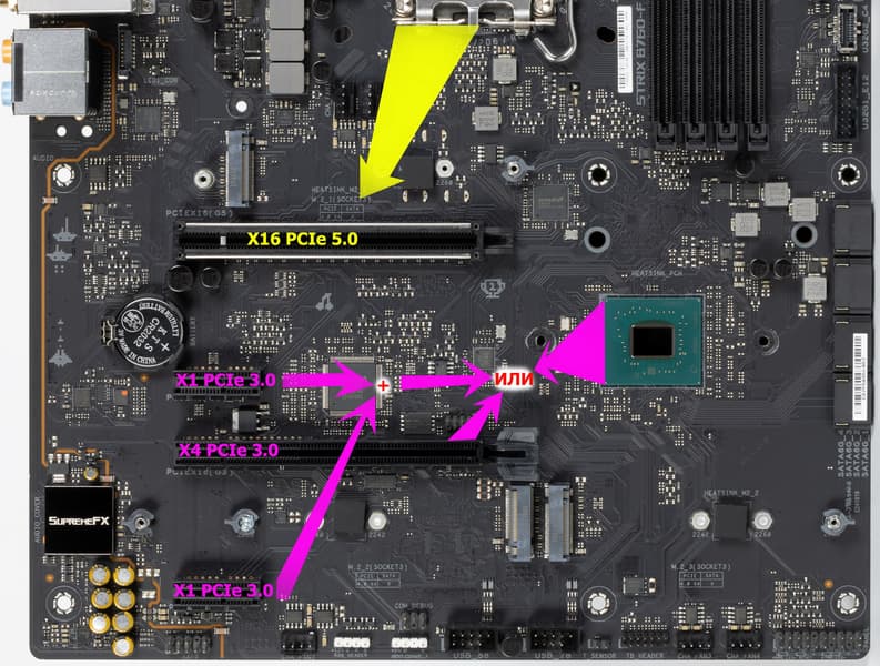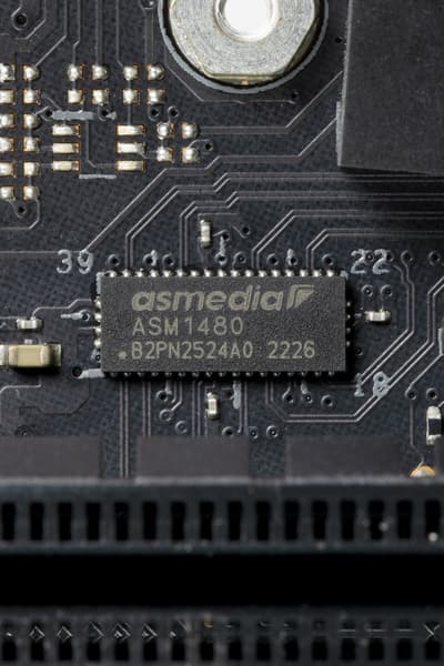 Для перераспределения линий PCIe в этих целях используется мультиплексор от ASMedia.