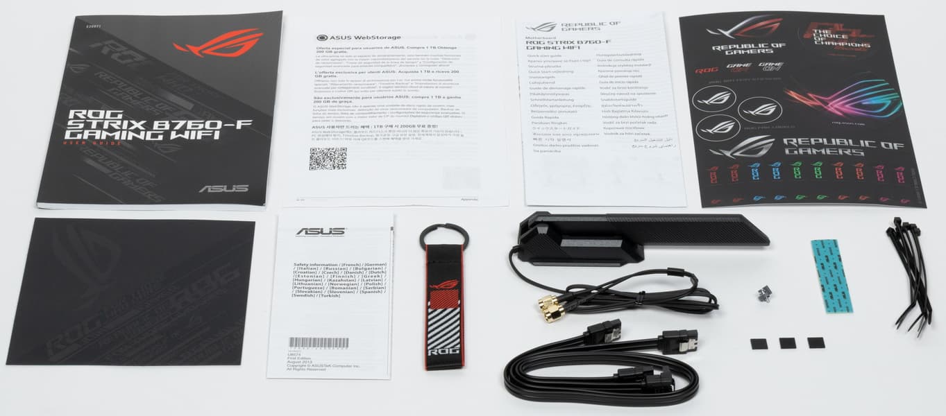 Asus ROG Strix B760-F Gaming WiFi поставляется в стандартной коробке фирменного дизайна серии ROG. Комплект размещен под платой в отдельном отсеке.