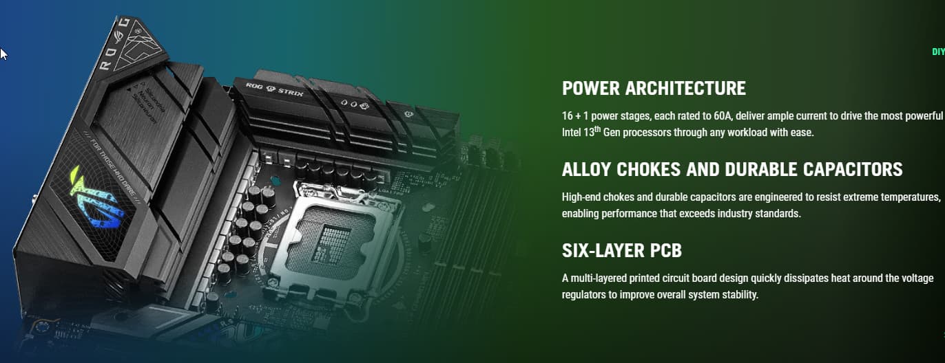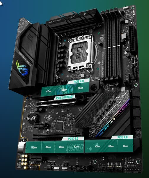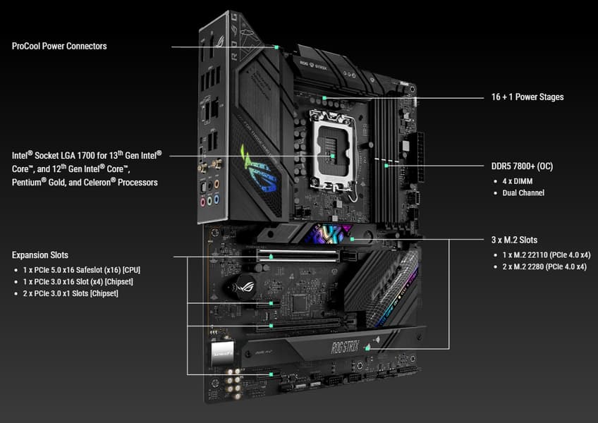 Asus ROG Strix B760-F Gaming WiFi поддерживает процессоры Intel Core 12/13-го поколений, выполненные под разъем (сокет) LGA1700.