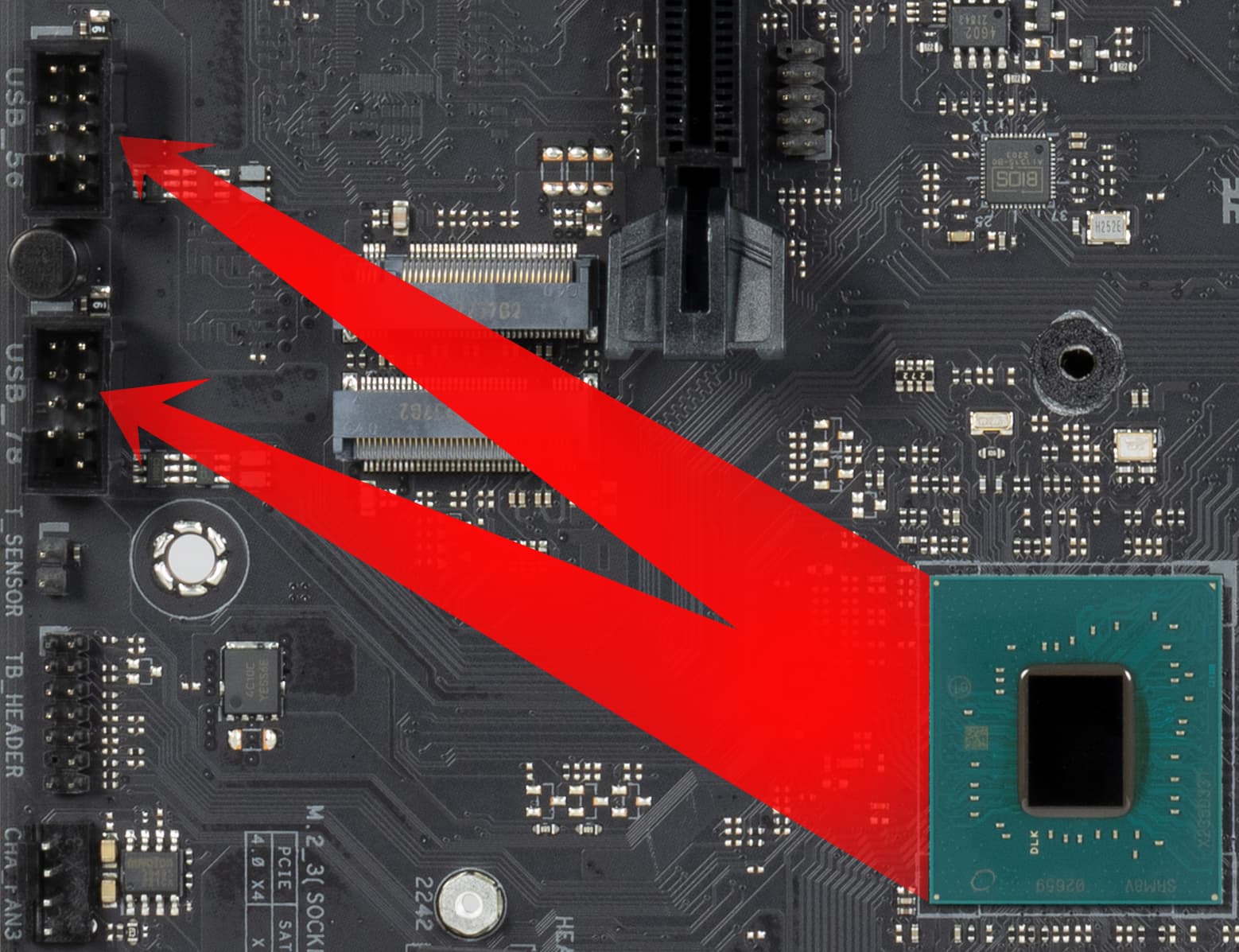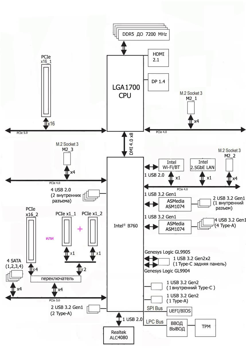 Процессоры Intel Core 12-го и 13-го поколения (совместимые с сокетом LGA1700 и поддерживаемые B660/760) имеют 20 линий ввода-вывода (16 PCIe 5.0, 4 PCIe 4.0), не имеют USB и SATA портов. При этом взаимодействие с B760 идет по особому каналу Digital Media Interface 4.0 (DMI 4.0 x4 (именно х4!)). Все PCIe линии процессора идут на слоты расширения PCIe и порт М.2. Serial Peripheral Interface (SPI) используется для взаимодействия с системой UEFI/BIOS, а шина Low Pin Count (LPC) — для связи с устройствами ввода/вывода, не требующими высокой пропускной способности (контроллерами вентиляторов, TPM, старой периферии).
