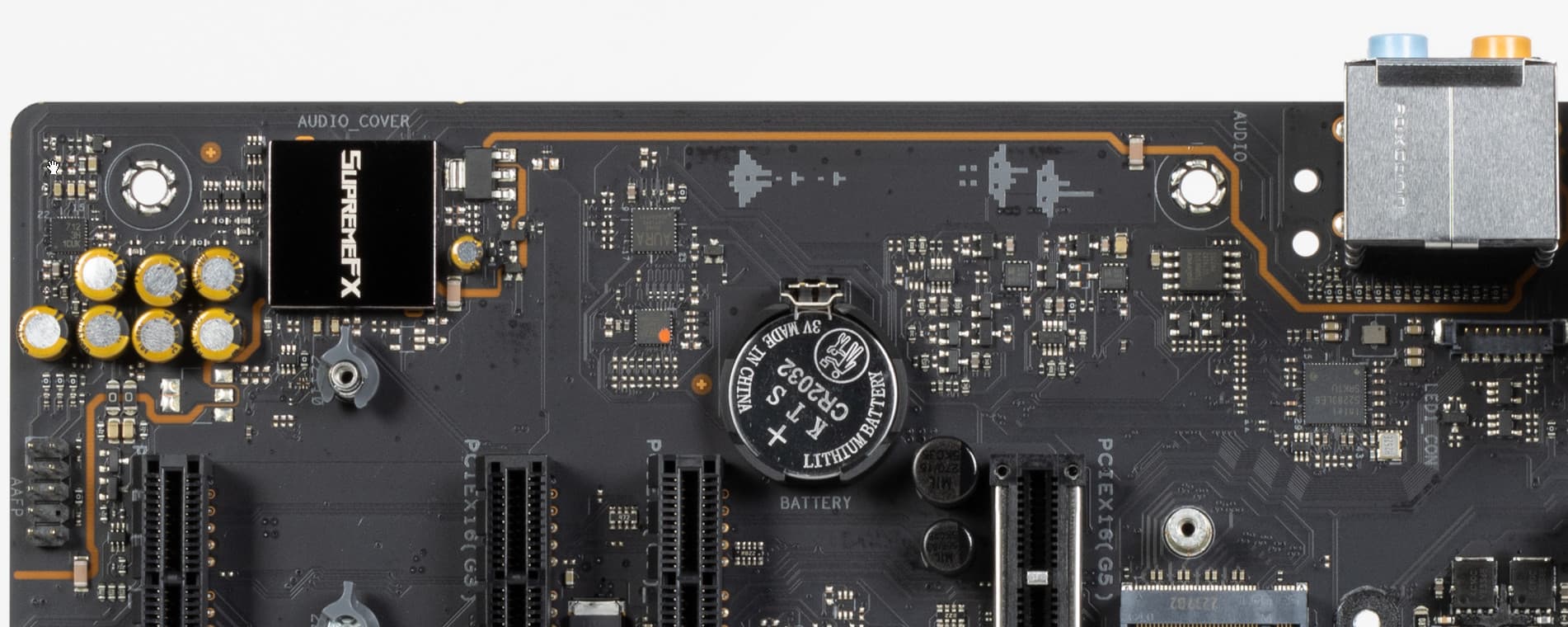 Аудиотракт вынесен на угловую часть платы, не пересекается с другими элементами. Все аудиоразъемы на задней панели имеют позолоченное покрытие, а также привычную цветовую окраску.