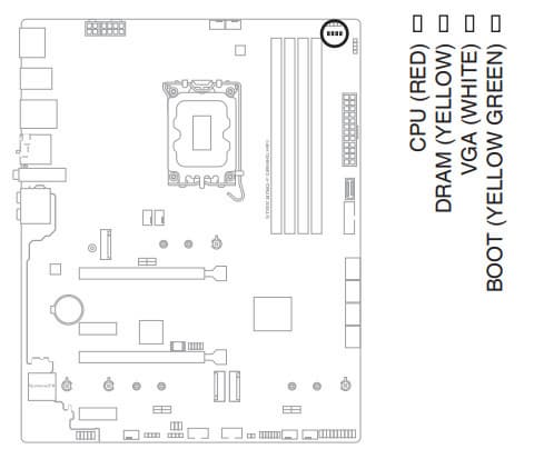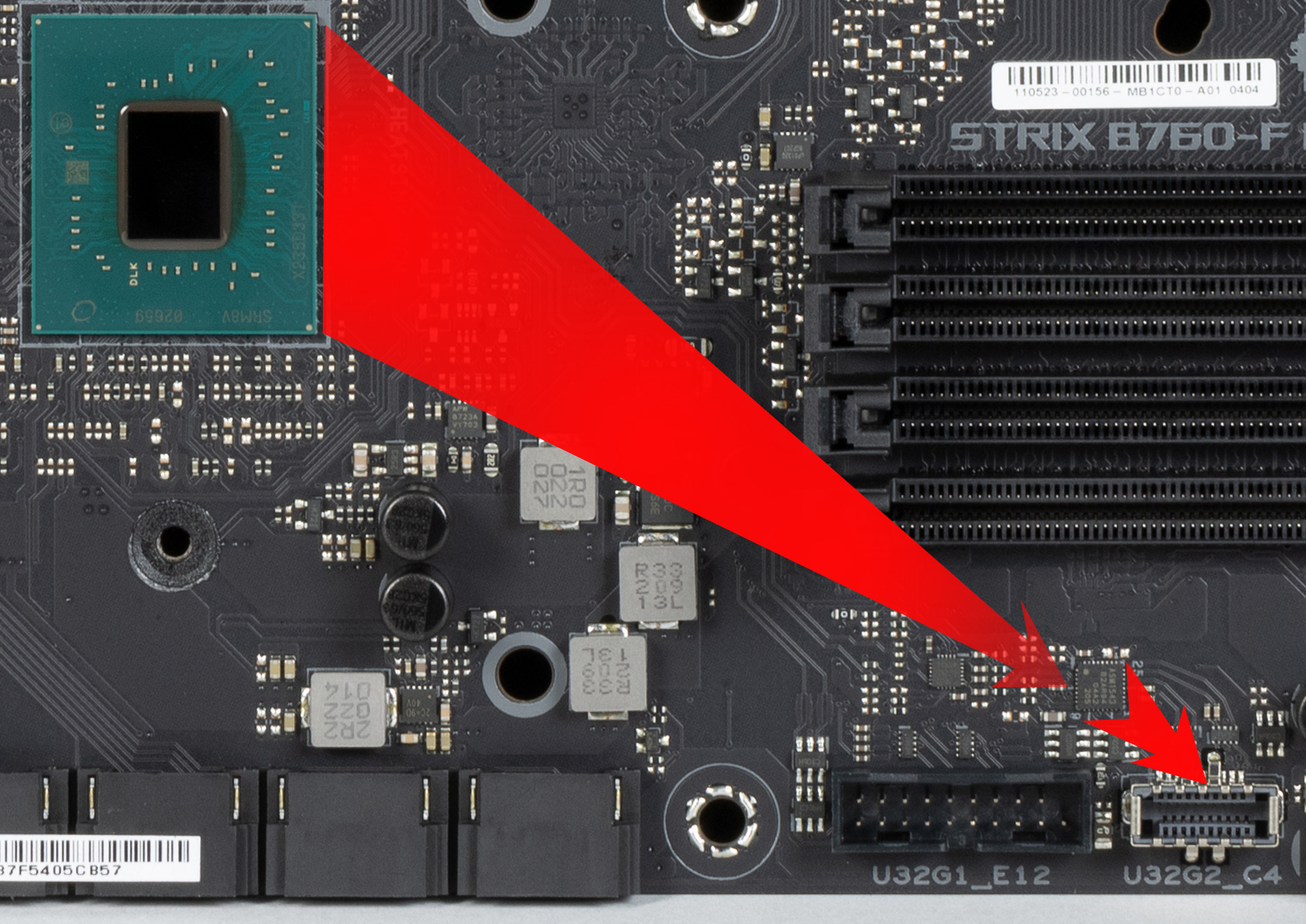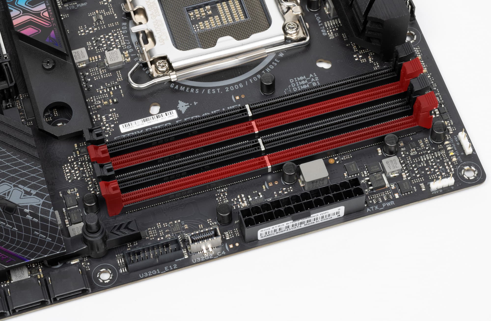Для установки модулей памяти на плате Asus имеется 4 DIMM-слота (для работы памяти в Dual Channel в случае использования всего 2 модулей их следует устанавливать в А2 и B2, отмеченных на фото красным цветом). Плата поддерживает небуферизованную память DDR5 (non-EСС), а максимальный объем памяти составляет 128 ГБ. Поддерживаются профили XMP.