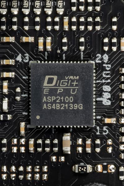 Управляет схемой питания VCore и iGPU фирменный ШИМ-контроллер Digi+ ASP2100.